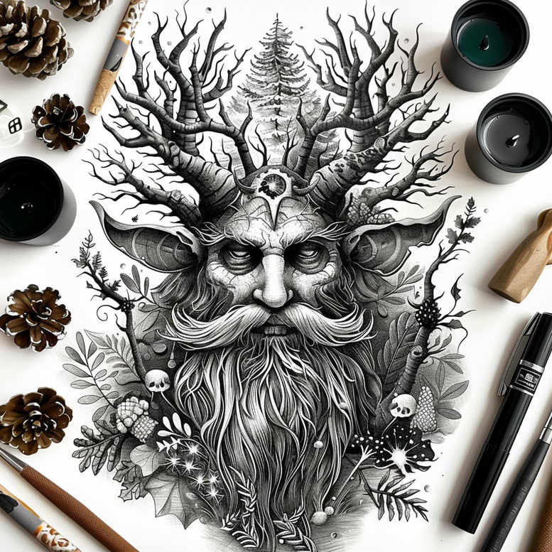 This concept presents a Leshy forest spirit rendered in black and grey, a monumental tattoo design that fuses human features with the wilderness. The central visage emerges from a tangle of branches that form a crown, the lines carved with surgical precision to capture the texture of bark and the weathered wisdom of age. Subtle skull motifs tucked among the twigs recall the forest’s cycles of life and mortality, while pinecones anchor the composition as symbols of renewal and seeds of growth. The beard dissolves into a network of tendrils that mimic roots and vines, reinforcing the unity between man and wood. The shading moves from deep blacks to soft greys, creating a striking contrast that enhances depth, dimension, and realism. The piece leans toward a fine line tattoo aesthetic with meticulous linework and smooth gradient transitions, suitable for a large arm or back canvas. Interpreting Slavic myth, the Leshy is a shapeshifting guardian of the forest often associated with hidden paths, weather, and the breath of ancient woods; in this tattoo the figure embodies strength, patience, and the moral ambivalence of nature itself. The crown of branches signifies sovereignty over the woodland realm, while the heavy shading grounds the image in the material world, making it both dramatic and wearable. For seekers of meaningful tattoos, this design offers a narrative of balance between civilization and wildness, a reminder of roots and resilience, expressed through ink as a custom tattoo design. The concept is AI-generated, exploring a mythic forest deity through an integrated portrait and natural elements to evoke mystery and reverence. This design is particularly suited for those considering cover-up work, as the dense black areas can be leveraged to mask prior tattoos while delivering a bold, timeless statement. In terms of style and technique, the piece reads as black and grey with realistic texture achieved through cross-hatching and stippling, a versatile approach that fits contemporary body art trends while honoring traditional Slavic folklore. The result is a tattoo that blends myth, memory, and craft into a single, enduring emblem of the forest and the self.