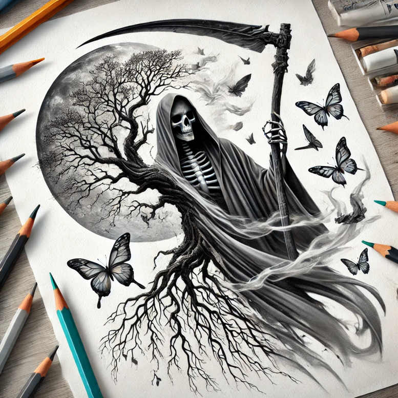 AI-generated tattoo project concept: a dark, black-and-grey composition featuring a skeletal Grim Reaper cloaked in flowing fabric, gripping a curved scythe that arches above a gnarled tree. A pale full moon sits behind, its soft gradient casting depth across the figure and roots, while butterflies drift around the scene, injecting motion and metamorphosis into the otherwise somber tableau. The design relies on high-contrast shading to sculpt the skeletal elements, the hood, and the draped cloak, with fine line work defining folds, bone structure, and subtle textures. The tree’s gnarly branches stretch toward the foreground and weave through the robed silhouette, hinting at entanglement between life and death. The moon provides a symbolic backdrop of cycles and endings, while the butterflies symbolize transformation and the fleeting nature of existence. Negative space is employed to keep key shapes legible on skin and to allow the black ink to remain dominant, making the piece highly visible as a tattoo design even from a distance. This concept is adaptable to a large canvas such as a back or sleeve, with room for additional elements or personalized symbolism; for smaller placements, density and line width can be modulated to preserve clarity. For those seeking meaningful tattoos, this composition merges mortality imagery with natural motifs to tell a story of transition, resilience, and renewal in a single cohesive image. Its AI origin may be noted as a modern origin of a tattoo project concept, and while the piece leans dark, it remains highly versatile for cover-up scenarios by leveraging dense black areas to mask existing ink. Keywords to optimize search include tattoo, tattoo design, meaningful tattoos, fine line tattoo, lotus flower tattoo, infinity tattoo, tribal tattoo, rose tattoo design, small tattoos, flower tattoos, custom tattoo design, Japanese style tattoo, black and grey, realistic tattoo, body art, ink.