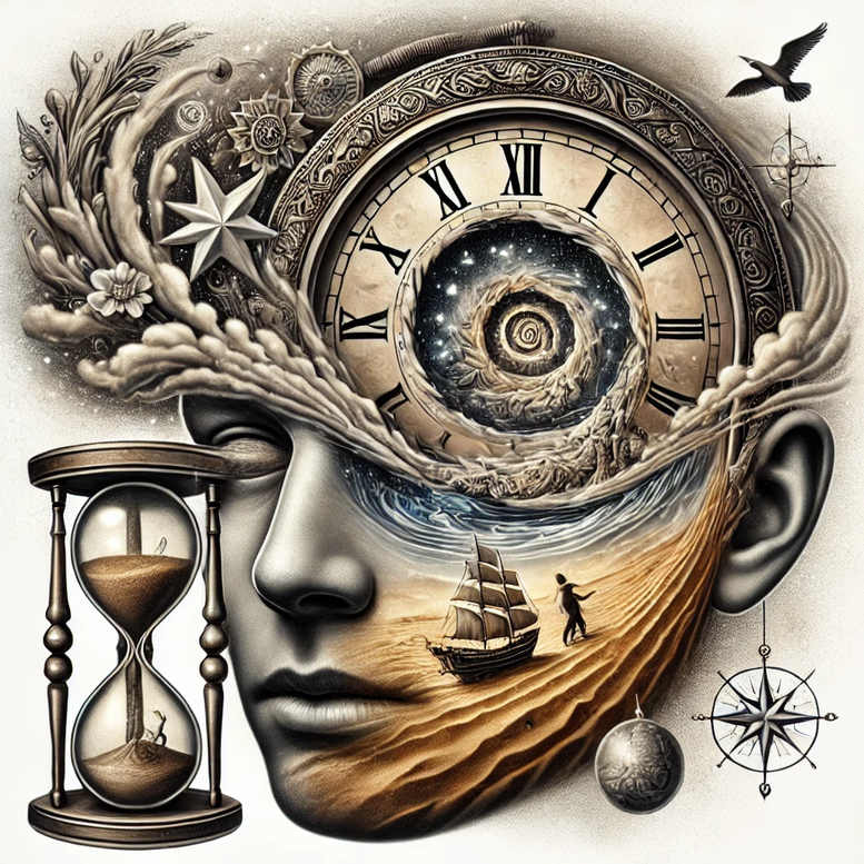 This AI-generated tattoo project presents a hyper-detailed, surreal portrait that merges time, sea and starry space into a single composition. The focal element is a large, ornate clock encircling the upper half of a head silhouette, its Roman numerals guiding the gaze toward a swirling galaxy that seems to pull the mind inward. From the clock’s edge, misty tendrils extend across the temple and cheek, weaving a beach scene where a lone ship rides a wave formed from shaded sand and wind. To the left of the face hangs an hourglass, its sands suspended like a moment in time, while a compass rose and a distant bird orbit the periphery as if the mind navigates through memory and dream. The palette is strictly black and grey, with dramatic chiaroscuro and fine line work that creates depth and texture without color. The artist employs a mix of stippling and smooth gradient shading to render the metallic gleam of the clock, the weathered wood of the ship, and the grain of the sand. This design plays with symbolism: time and memory slipping through the mind, voyage and exploration on both sea and subconscious, and celestial guidance offering meaning beyond the surface. While richly detailed, the piece remains cohesive, letting each element breathe within negative space as the head forms a living canvas. The result is a tattoo design suitable for a statement piece or a cover-up, especially where deep blacks and dense line-work require concealment; pattern-rich motifs enhance texture. Its AI-generated genesis marks it as a modern, experimental approach to body art and ink, balancing realism with dreamlike fantasy, and inviting personalized adjustments in scale and placement, from fine line tattoo accents to larger black and grey realizations. In short, this tattoo design offers meaningful tattoos, a blend of classical symbolism with contemporary innovation, and a bold black-and-grey execution that resonates as body art, ink, and a timeless narrative.