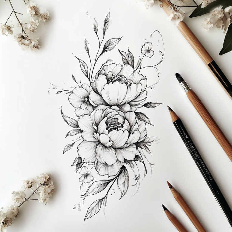 Flower bouquet, pencils, and paper sketch in black and grey; tattoo design idea, suitable for cover-up.