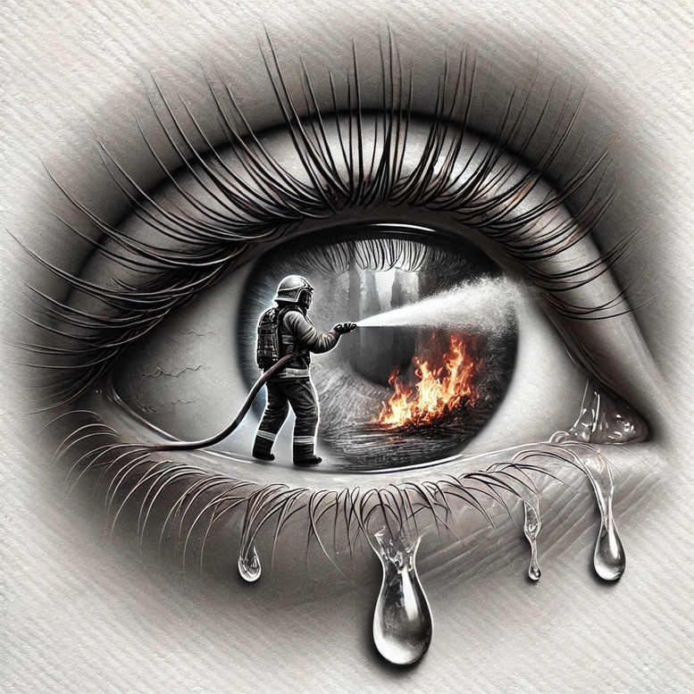 This is an AI-generated tattoo project concept, presenting a grayscale eye portrait that embeds a dramatic rescue scene within the pupil. A firefighter in full turnout gear stands at the threshold of a blazing inferno, directing a high-pressure stream toward the flames as smoke curls in the air. The surrounding iris and cornea provide a reflective stage for the action, with soft gradient shading that blends skin tone into the eye’s glassy surface. Water droplets cling to the lower lid and eyelashes, some stretching as tears fall, which adds emotional resonance and reinforces the idea of protection and endurance under pressure. The composition balances cinematic movement with technical precision: the firefighter is detailed enough to read as a figure at a close distance, while at mid-distance the flame reads as a warm counterpoint against the cool grayscale tones. The eye serves as a natural metaphor for perception, a window to inner strength, and the inner scene suggests that courage can illuminate even the darkest moments. From a tattoo design standpoint, the piece offers both fine-line opportunities for the figure and broader shading for the fire and smoke, enabling a dynamic range of contrast on skin. The concept is well suited for larger canvases like the back or thigh, yet scaled down for forearm or calf without losing readability. It is ideal for clients seeking meaningful tattoos that tell a story, such as those exploring resilience, memory, or honoring first responders. The design leans into black and grey realism, with subtle highlights to mimic glassy eye texture and the reflective surface within the pupil. Given its dense dark areas and bold central figure, it also works well as a cover-up tattoo by concealing older ink while preserving the emotional message. Keywords guiding the concept include tattoo, tattoo design, meaningful tattoos, fine line tattoo, lotus flower tattoo, infinity tattoo, tribal tattoo, rose tattoo design, small tattoos, flower tattoos, custom tattoo design, Japanese style tattoo, black and grey, realistic tattoo, body art, ink.
