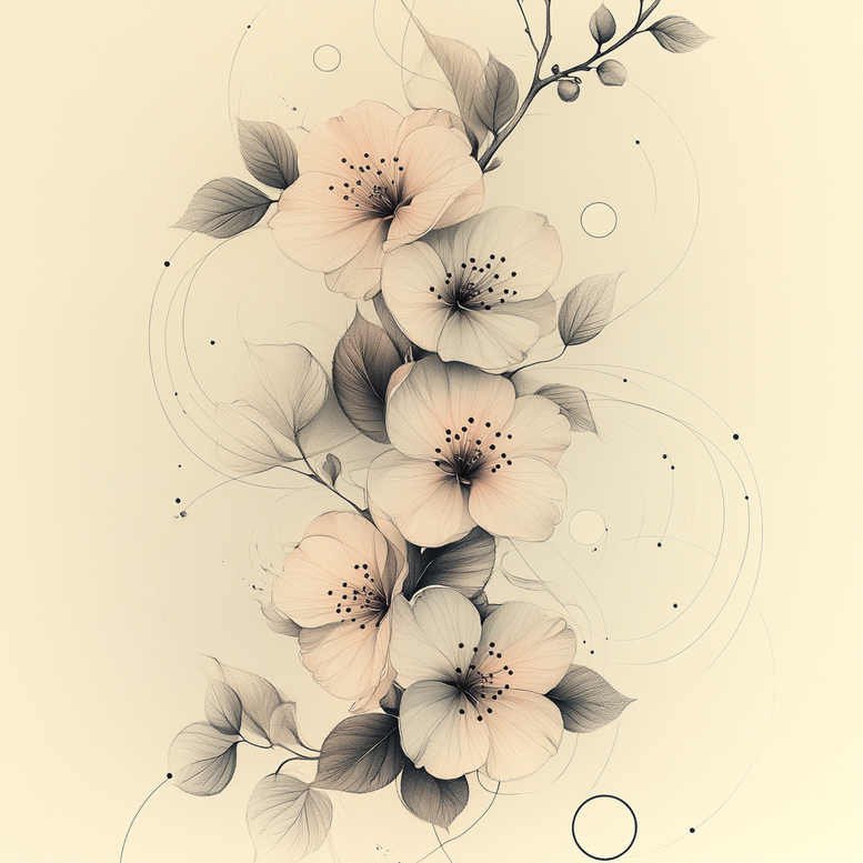 AI-generated tattoo project: this elegant botanical study translates a vertical cascade of blossoms into a wearable floral tattoo concept in black and grey. The central motif comprises five hibiscus-like flowers arranged along a slender stem, each petal softly shaded to suggest volume, with fine line contours and subtle stippling that invite light and depth without heavy saturation. Leaves trail along the stem in a naturalistic arrangement, their veins rendered with precise line work that maintains a delicate, airy feel. Surrounding the botanical cluster are circular rings, arcs, and scattered dots that introduce pattern-like rhythm to the composition, giving the piece a modern, graphic edge while preserving botanical realism. Executed in a fine-line technique, the work relies on crisp outlines and nuanced grayscale gradations to achieve a sense of three-dimensional form on skin. The design reads as a versatile tattoo design suitable for a variety of placements—forearm, rib, or back—where a vertical flow and adaptable scale can integrate with existing work or serve as a standalone statement. Symbolically, blossoms symbolize renewal and beauty; the entwined stem suggests connection and growth, while the circular motifs evoke cycles and continuity. This concept aligns with meaningful tattoos and small-to-medium pieces, offering a custom tattoo design that remains true to black and grey aesthetics, with potential for subtle shading to enhance realism. As an AI-generated tattoo project, it showcases how pattern elements and precise line work can produce refined body art that is both timeless and on-trend, accessible to clients who appreciate a modern botanical motif in a traditional sense. In practice, artists may tailor the scale, contrast, or add motifs such as lotus flower tattoo, infinity tattoo, or rose tattoo design accents, while preserving the fine-line, black-and-grey approach that suits body art and ink.