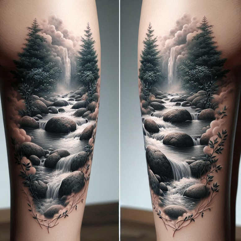 An AI-generated tattoo project presents a realistic black and grey landscape that curves gracefully along the leg, depicting a tranquil mountainside river scene. A waterfall tumbles over rounded stones into a shimmering stream, while evergreen pines rise at the edge of the composition and wispy clouds drift above. The lower foreground is threaded with delicate branches and foliage that anchor the scene to the skin, creating depth through contrasts of light and shadow. The rendering relies on fine line technique, stippling, and smooth gray gradients to capture texture in the rocks, water, and foliage, producing a tattoo design that reads clearly from a distance and upon closer inspection. The grayscale palette emphasizes form, negative space, and subtle reflections in the water, resulting in a timeless piece of body art suited for a larger area such as the leg. Symbolically, the flowing water suggests renewal, while trees and stones symbolize endurance and stability, inviting personal interpretation in the context of meaningful tattoos and custom tattoo design. This project demonstrates how black and grey ink can convey atmosphere, momentum, and quiet majesty without color, while achieving photorealistic shading through careful layering and contrast. The composition can be adapted in size and spacing to fit individual anatomy, and as a cover-up option for darker inks in a preceding tattoo, thanks to its bold silhouettes and layered shading that help mask underlying work. In addition to its aesthetic appeal, the piece balances natural motifs with a modern tattoo technique, making it suitable for tattoo enthusiasts seeking a striking landscape design, a fine line yet broad-toned composition, and long-lasting readability as the skin ages. Overall, this AI-generated tattoo project embodies a sophisticated landscape idea that merges nature-inspired storytelling with professional realism, offering a versatile template for custom tattoo design and future refinements in line weight, texture, and scale.