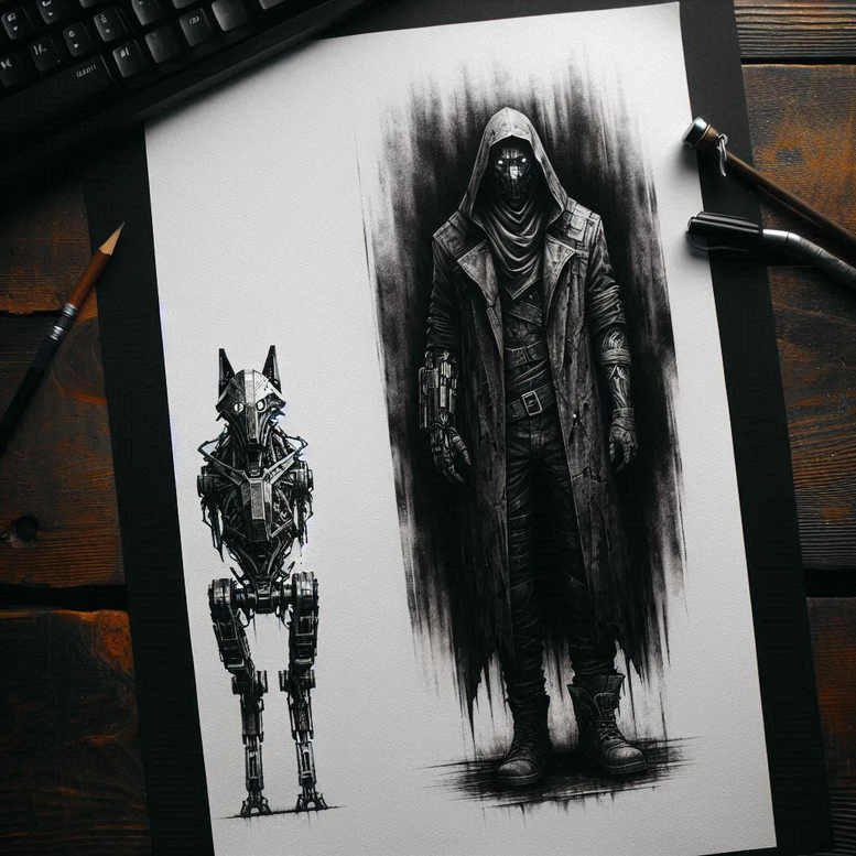 These are AI-generated tattoo projects exploring a stark, monochrome vision: a tall hooded figure in a long coat stands beside a cybernetic dog, both rendered in black and grey with bold brush-like shading that bleeds into the surrounding negative space. The composition emphasizes a strong vertical axis, crisp line work, and a balance between solid blocks of ink and delicate stippling to create depth. The figure’s hood shadows the face while the trench coat and gloves form a dominant silhouette, suggesting mystery and resolve; in contrast, the robotic dog on the left is built from geometric plates and articulated joints, its stance rigid yet attentive. Graphical patterns emerge from the mechanical detailing and the smoke-like edges around the subjects, giving the piece a dynamic rhythm that reads well as a tattoo design. The gun held by the figure introduces tension, while the overall darkness cues a perfect cover-up solution for concealing prior work. Technically, the piece blends blackwork with fine line shading, offering strong contrast for black and grey tattoos and allowing faithful scaling from small motifs to larger back- or sleeve-sized compositions. The design invites adaptations toward Japanese-style influences or modern tribal accents, yet remains legible and striking in any scale. If you’re seeking meaningful tattoos with a cinematic mood, this concept delivers a bold narrative in ink and a versatile, cover-up-friendly layout that harmonizes texture and form through pattern-like motifs. These are AI-generated tattoo projects designed to inspire custom tattoo design conversations and to showcase the potential of AI-driven art in the tattoo world.