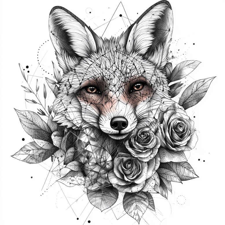 This tattoo design blends a fox portrait with geometric triangulation and a cluster of roses, forming a contemporary motif that fuses fauna with botanical geometry. The central fox head is rendered in grayscale with smooth shading, while a lattice of fine lines and sharp angles dissolves into petals and leaves at the edges, creating a linework-centric composition that reads clearly on varying skin tones. The roses are richly detailed with layered shading and precise linework, offering a soft counterpoint to the angular geometry and yielding a harmonious balance between organic form and engineered structure. The piece aligns with fine-line tattoo aesthetics, with crisp lines that translate well in black-and-grey inks. Negative space and subtle dot-work contribute depth and motion, giving the piece a dynamic feel that translates well from a small forearm tattoo to a larger back or sleeve. Symbolically, the fox suggests cunning, adaptability, and guardianship, while the roses symbolize beauty, renewal, and resilience; together they form a meaningful tattoo concept that fits within popular categories such as flower tattoos, small tattoos, and custom tattoo design. The black-and-grey palette aligns with realistic tattoo aesthetics, ensuring strong contrast and longevity, and the refined linework supports adaptations toward Japanese-style tattoo influences, tribal undertones, or purely contemporary geometric approaches. This is an AI-generated tattoo project designed to inspire artists and clients seeking a modern interpretation of traditional motifs, with pattern elements that invite customization while preserving a cohesive narrative about ink, meaning, and body art.