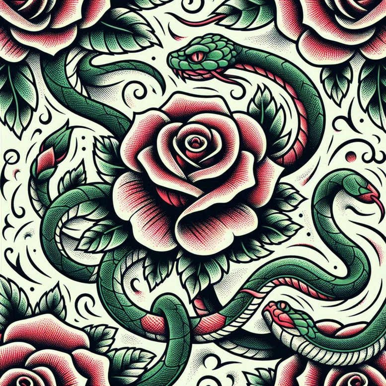 This AI-generated tattoo project concept presents a dynamic composition where a blooming rose and a sinuous green snake weave together in a seamless tapestry. The central element is a lush rose rendered with bold black outlines and smooth gradient shading that gives the petals a velvety depth, while the snake coils around the flower, its scales picked out in dark green with lighter highlights to convey texture and movement. Leaves with sharp serrated edges frame the flora, and subtle stippling adds tonal richness to the background, creating a sense of depth and contrast that anchors the piece in a traditional tattoo vocabulary. The design relies on contrast between bright red petals and the emerald-green serpent, a classic color pairing that reads well on skin and translates well to a full-color tattoo. The overall composition balances organic curves with angular, repetitive linework that guides the eye along the snake’s sinuous path and around the rose’s spiral. This concept embraces both floral beauty and reptilian symbolism: the rose suggests love, passion, and renewal, while the snake hints at transformation, resilience, and protection. In a tattoo context, this motif works well as a back piece, thigh, or shoulder work, where the respondent has ample space to accommodate the scale of the snake and the bloom. Although rooted in traditional iconography, the piece can be adapted into a Japanese-style tattoo with additional motifs such as waves or cherry blossoms, or reinterpreted in black-and-grey for a more understated look. The technical execution features clean, even linework, crisp color fills, and controlled dot shading to achieve smooth transitions between tones. As an AI-generated tattoo project concept, it demonstrates how classic symbols can be reimagined with modern color and composition to produce a striking body art piece. Whether used as a standalone statement or as part of a larger sleeve, the rose-and-snake design offers meaningful tattoos potential for clients seeking bold, colorful, and symbolic ink.