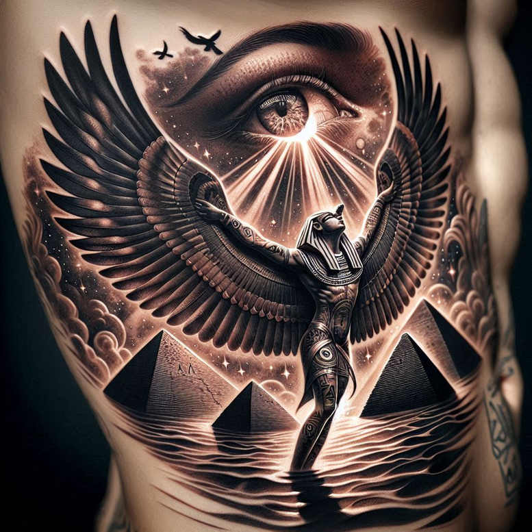 This is a tattoo gallery inspired by Horus from Egyptian mythology – include this in every description. The artwork presents a powerful Horus-inspired composition rendered in black and grey, where a central falcon-winged figure rises above a row of pyramids as a sun disk radiates light behind and long rays sweep outward. The design relies on strong contrasts and a masterful gradient, giving depth to feathered wings and carved stone forms, while negative space around the figure emphasizes motion and ascent. The repeating geometric pyramids create a pattern that anchors the scene and echoes ancient Egyptian symbolism; this repeating motif adds rhythm and a timeless, tattoo design quality that reads both mythic and modern on the skin. The subject embodies protection, royal authority, and solar symbolism—the falcon deity Horus guarding the wearer as light pours from the sun, a metaphor for insight, balance, and resurgence. The black and grey palette enhances realism, giving the wings a tactile texture, the pyramids a weathered stone appearance, and the sun disk a glowing halo that casts highlights across the composition. The piece favors a vertical flow, with the wings framing the figure and guiding the eye upward toward the sun, while the base of pyramids provides grounding. This concept is presented as an AI-generated concept, offering a contemporary twist on a classic myth and a strong candidate for a custom tattoo design that can adapt to different sizes and placements, inviting a personal connection with meaning and identity. In terms of style, it sits within black and grey, realistic tattoo art that prioritizes line work and shading to achieve lifelike texture, yet remains versatile for large-scale body art. It also embraces repeating geometric elements that reinforce the pattern and rhythm of the composition, making it a timeless piece for collectors seeking meaningful tattoos and a bold statement in body art. The design exemplifies the core values of tattoo artistry: craft, narrative, and resonance, while remaining suitable for a dramatic back or sleeve. The concept acknowledges the modern interest in AI-assisted design, offering a bridge between ancient symbolism and contemporary ink practice, and reinforcing why Horus remains a potent source of inspiration for tattoos that symbolize protection, higher vision, and renewal.