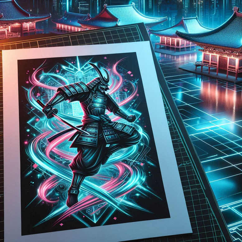 An AI-generated tattoo project concept, this neon-infused samurai design pairs traditional Japanese armor with cyberpunk energy, ideal as a bold tattoo design for a back, sleeve, or chest piece. The central figure is a armored samurai mid-stride, gripping a curved katana, with luminous cyan and magenta swirls circling the blade and weaving behind the figure. The composition sits inside a poster-like frame, resting on a glassy grid of blue tiles that recede into a neon cityscape. The armor is rendered with crisp line work and high contrast shading to suggest metallic plates and subtle texture, while the energy swirls act as graphic patterning that enhances movement and focus on the warrior. The color scheme is full color, with electric blues, pinks, and subtle purple hues designed to reproduce glow and depth on skin when translated into tattoo ink. From a tattooing perspective, the design supports clean linework, bold color blocks, and gradient shading to simulate neon glow, making it suitable for large-format tattoos as a statement piece or as part of a larger Japanese style tattoo palette. The symbolism merges the ancient code of the samurai—discipline, honor, and perseverance—with a modern urban environment, suggesting resilience amid neon-lit city life; this aligns with meaningful tattoos that aim to tell a story through strong imagery. For artists, the piece offers opportunities to explore fine line tattoo accents around armor joints, broad color washes in the background, and controlled use of white highlights to evoke light reflections. This project demonstrates how digital art concepts translate into tattoo-ready designs, and it is presented here as an AI-generated tattoo project concept that can be refined for tattoo ink, body art, and custom tattoo design workflows.