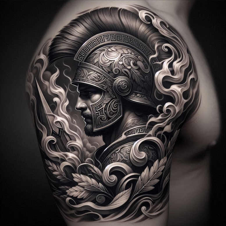 AI-generated tattoo project concept in black and grey realism, illustrating a helmeted Roman warrior in a full-sleeve design. The focal element is a profile of a battle-ready helmet carved with intricate engravings and a Greek-key border, set against curling smoke and flowing laurel leaves that wrap around the limb. Dense, near-absolute black shading anchors the piece, while mid-tones render the fine line work of the helmet’s etchings, the warrior’s brow, and the edge of the visor; lighter greys create the soft wisps of smoke that race across the skin and contrast with the solid silhouette of the helmet. The composition relies on a strong central motif—helmet and face—around which ornamental patterns bloom, producing a dynamic rhythm that reads as a single, cohesive sleeve when extended. The laurel elements symbolize victory and resilience, appropriate to a personal narrative of triumph, while the smoke evokes movement, impermanence, and transition; together they form a timeless, meaningful tattoo design that suits someone seeking a bold, signature piece. The style leans toward black and grey realism with graphic patterning, including engravings and geometric motifs that add texture and depth, and can be adapted with subtle fine-line detailing or expanded with additional elements if desired. As an AI-generated tattoo project concept, it demonstrates how classical imagery can be reimagined for modern body art, combining traditional symbolism with contemporary shading techniques to achieve a dramatic, long-lasting effect. This design intentionally leverages high-contrast areas to enhance legibility on skin over time, making it an excellent candidate for covering older tattoos thanks to its dense tonal range; the result is a powerful statement piece that remains legible and striking at a distance, as well as up close on close inspection.