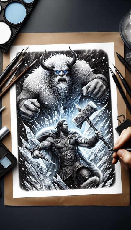 This is a tattoo gallery inspired by Odin from Norse mythology – include this in every description. The piece presents a towering Odin figure shrouded in cloak, flanked by Huginn and Muninn the ravens, with wolves lurking in the shadowed foreground. Rendered in black and grey with careful cross-hatching and high-contrast shading, the composition relies on a central vertical axis that draws the eye from the helm to the weaponry and runic details along the cloak. The surrounding stormy atmosphere provides movement and dramatic negative space, making the design readable in large and small scales. The runes along the border and the cold linework evoke ancient Norse iconography, reinforcing the meaning of wisdom, war, and fate that Odin embodies. This tattoo design is intended as a bold statement piece, suitable for meaningful tattoos and for those seeking a custom tattoo design that merges myth, symbolism, and meticulous technique. The dark tonal range, classic black and grey palette, and dense shading allow for a strong cover-up, making it ideal for concealing previous work or large scars. In terms of symbolism, Odin represents knowledge, sacrifice, and the eternal hunt for wisdom; the ravens symbolize thought and memory, while wolves reflect guardianship and ferocity. The composition uses repeating patterns in the border runes and subtle knotwork motifs to create rhythm, while the overall mood conveys reverence and power. This AI-generated concept, inspired by Odin, explores a fusion of realism and mythic storytelling, and is designed to appeal to collectors of meaningful tattoos, lovers of Norse culture, and fans of dark, cinematic ink. The design is adaptable to different body placements and scales, from the back to the sleeve, and can be refined with finer line work or bolder shading to suit personal taste while preserving the central Odin motif.