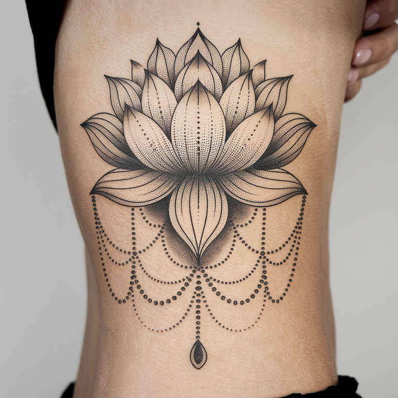 A lotus flower tattoo rendered in black and grey on the leg presents a refined study in line and dotwork. The central lotus is built from layered petals with clean outlines and subtle shading that builds a gentle gradient from edge to center, delivering the crisp precision of a fine line tattoo while maintaining a soft, organic feel. Below the bloom, a cascade of beadwork forms a draped pattern—a series of evenly spaced dots connected into arches that resemble jewelry strands—ending in a teardrop pendant. This pattern element adds movement and elegance while guiding the eye downward along the limb. The design combines a traditional lotus motif with contemporary dotwork, achieving a balanced composition that reads as both delicate and bold depending on lighting. The artwork is optimized for black and grey ink, preserving contrast through crisp line work and stippled shading that evokes depth without heavy fill. As an AI-generated tattoo project concept, it invites customization: the size, spacing, and pendant size can be adjusted to fit forearm, thigh, or calf placement, while the beaded chain can be extended or reduced to suit a cover-up or a stand-alone piece. Symbolically, the lotus signifies purity and spiritual awakening, the beaded curtain suggests continuity and connection, and the pendant alludes to memory and protection—an embodiment of meaningful tattoos that resonates with personal narratives. The composition also nods to infinity tattoo and tribal tattoo linework, while remaining faithful to Japanese style tattoo sensibilities—clean geometry, restrained shading, and a black-and-grey palette. This design supports a wide range of placements and scales, appealing to lovers of flower tattoos, small tattoos, and custom tattoo design, and it pairs well with concepts of ink, body art, and the enduring allure of fine-line, realistic tattoo aesthetics.