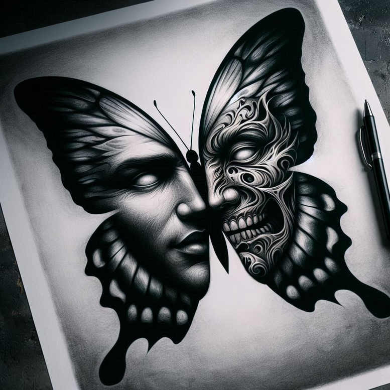 An AI-generated tattoo project that blends realism with ornate patternwork, this design pairs a serene female face with butterfly wings that morph into a skull on the right. Rendered in black and grey, the left wing carries soft portrait shading, while the right wing unfolds into intricate, filigree-like spirals that echo bone and teeth. This juxtaposition symbolizes transformation, duality, and the passage from innocence to mortality, making it an ideal choice for meaningful tattoos about growth, renewal, and the cycles of life. The composition relies on strong silhouettes and careful line work to maintain legibility across placements, from small forearm pieces to larger sleeve panels. The presence of graphic patterns on the right wing qualifies it as pattern and invites customization—patterns can be intensified or simplified to suit personal taste. Given its bold contrast, the piece is particularly cover-up friendly, capable of integrating older ink into a cohesive new statement while preserving a coherent flow with surrounding tattoos. The design nods to Japanese and Gothic aesthetics through a restrained black-and-grey palette, yet it remains accessible to modern body art sensibilities, including fine line tattoo and realistic tattoo approaches. The butterfly motif carries metamorphosis symbolism, while the skull adds a reminder of mortality and resilience; together they form a narrative that can be extended with lotus flower tattoos or other floral elements for a broader story. This tattoo concept embodies a custom tattoo design ethos: you get a unique, meaningful tattoo design that translates well into ink, complements existing work, and stands as a durable piece in any portfolio. AI-generated elements serve as a spark for creativity, guiding artists to explore new textures and compositions while maintaining practical considerations for skin tone and placement, ensuring the final portrait-like quality reads well with ink and ages gracefully.