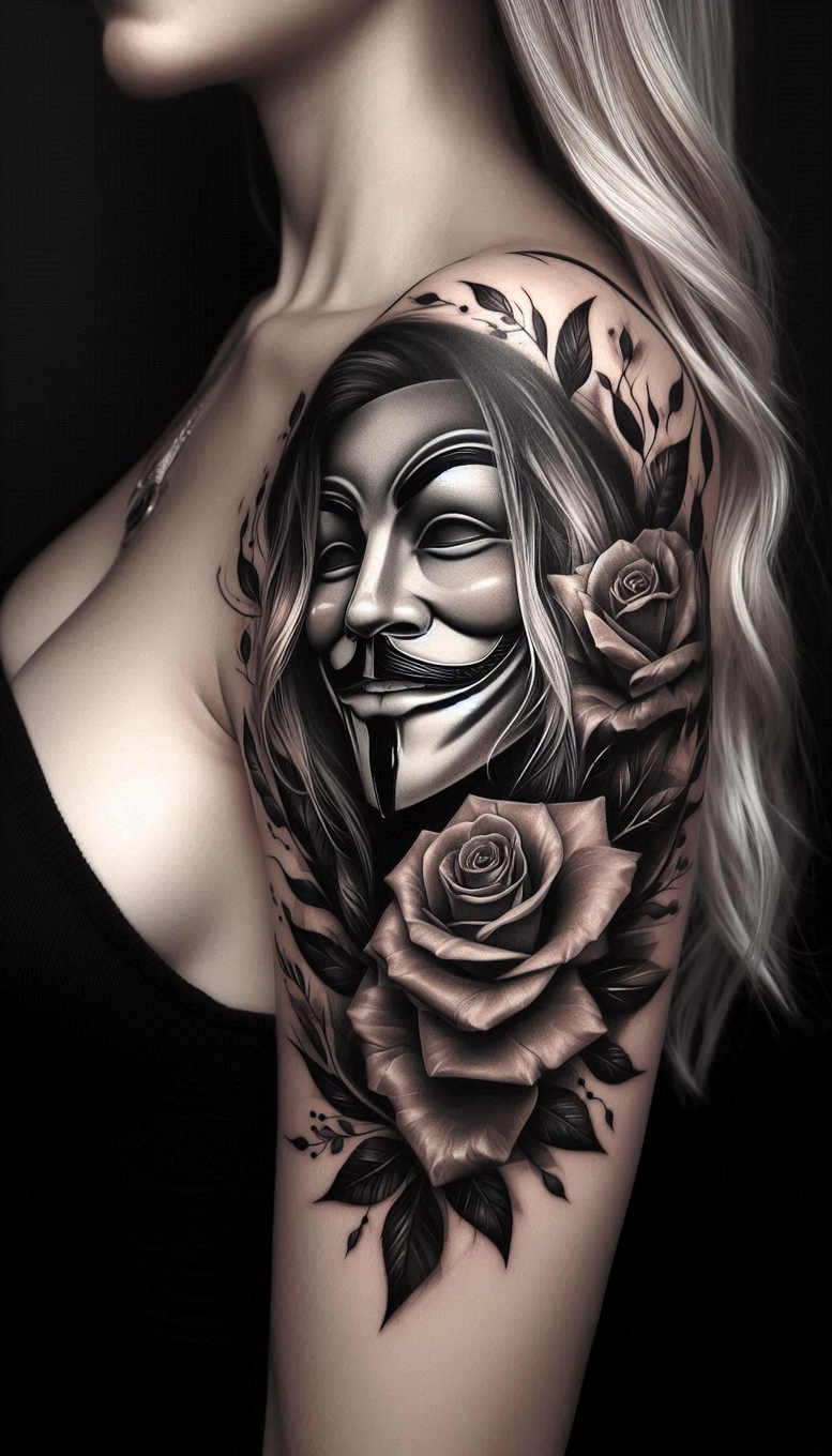 An upper-arm black-and-grey realism tattoo fusing a masked visage with blooming roses and trailing leaves. The central mask is rendered in grayscale with smooth gradations, crisp contour lines, and strategic highlights to create a sculpted, almost three-dimensional impression. Surrounding roses unfold in layered petals, their shading building depth and creating a soft counterpoint to the mask’s stark geometry. Leaves and vines trace along the shoulder and upper arm, guiding the eye in a wraparound flow that reads as a single cohesive piece. The technique emphasizes high-contrast black ink and refined shading to preserve clarity as skin ages, ensuring the motif remains legible on a large canvas. Symbolically, the mask hints at anonymity or rebellion, while roses symbolize beauty, memory, resilience, and transformation—an evocative pairing for meaningful tattoos. The design sits comfortably as a full-sleeve-capable motif yet reads strongly on the upper arm as a statement piece. It is tattoo design-ready and particularly suitable for a cover-up due to dense dark areas that can obscure older marks without losing detail; the surrounding florals offer flexibility to extend art over time. This is an AI-generated tattoo project illustrating how a realistic rose-and-mask concept translates into wearable body art. For search discoverability, the project aligns with terms like tattoo, tattoo design, meaningful tattoos, rose tattoo design, black and grey realism, realistic tattoo, flower tattoos, lotus flower tattoo, infinity tattoo, tribal tattoo, Japanese style tattoo, fine line tattoo, small tattoos, custom tattoo design, black and grey ink, and body art. The motifs of mask and roses provide a bold, timeless narrative suitable for collectors of high-contrast ink.