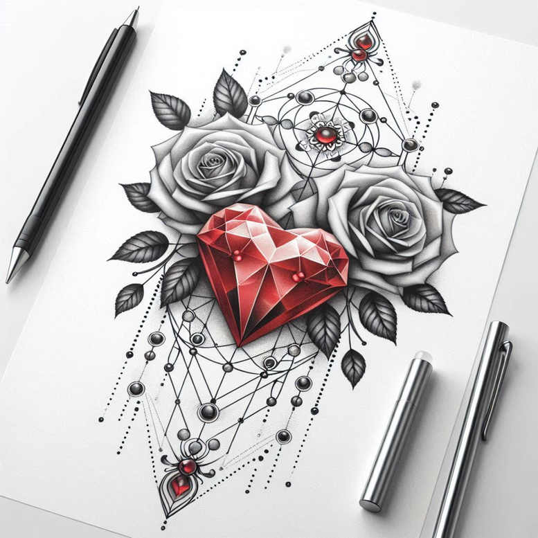 This tattoo design concept blends a bold central heart gem with delicate grayscale florals and a geometric network, creating a striking fusion of realism and pattern. At the heart of the composition sits a faceted red gem in the shape of a diamond-like heart, rendered with sharp facets and subtle highlights to convey depth and a jewel-like luster. Surrounding it are two traditional roses in black and grey, their petals shaded to reveal soft curvature and natural texture, while leaves provide contrast and movement. A lattice of geometric lines, or web, threads through the composition—dotted connectors, circles, and tiny spheres that evoke jewelry chains and constellations—giving the piece a modern, ink-heavy feel. A dangling pendant shape at the bottom, echoing the heart motif, anchors the design and adds vertical balance. The overall effect is a tattoo design that reads as both romantic and disciplined, merging fine line tattoo technique with geometric patterning. The grayscale shading insists on atmosphere and depth, while the red gemstone supplies a bold focal point that can be adjusted for vibrant color or kept with black and grey for a subtler look. Symbolically, the heart gem signifies love, vitality, and energy, while roses symbolize beauty and growth; the geometric framework communicates structure, connectivity, and a modern aesthetic. This concept offers strong potential for a cover-up or as a standout standalone piece, especially for someone seeking a statement tattoo that remains versatile in placement. The piece can be adapted across sizes, from small tattoo designs to larger back or chest works, and works well with other motifs such as lotus flower tattoo elements or infinity tattoo symbols if desired. It also translates well into a custom tattoo design for Japanese style tattoo aficionados or those seeking black and grey realism with decorative line work. Note that this is an AI-generated tattoo project concept, intended to illustrate possibilities for a highly detailed, pattern-rich piece that balances iconography with precision line work and ink textures.