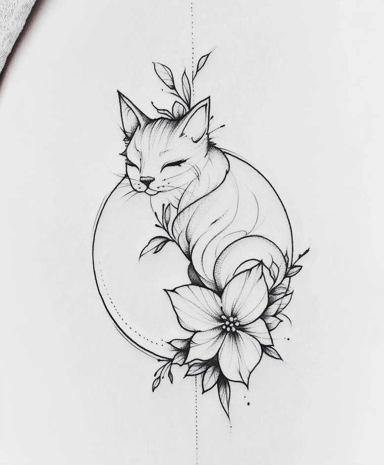 This piece presents a clean, fine-line tattoo concept drawn in black ink, centered on a serene cat curled around a crescent-like circle, with a lily and leafy accents threading through the composition. Executed with careful, continuous strokes, the design relies on crisp outlines and restrained shading to preserve legibility at small sizes while offering the potential for subtle gradation if desired. The feline form breathes calm and companionship, its tail curling along the circle’s interior to suggest continuity and protection. The circular motif anchors the image, creating a unified silhouette that reads clearly as a tattoo design in both solo and larger arrangements. The lily provides a gentle focal point at the lower border, its layered petals and fine veinwork balancing the cat’s soft fur texture and creating visual interest without crowding the composition. Leaves weave between elements, introducing organic movement and a touch of natural elegance. As an AI-generated tattoo project, this concept is presented as a flexible base for a custom tattoo design, with room for adaptation: artists can adjust line weight for different skin tones, add stippling shadows for texture, or incorporate additional motifs such as a lotus flower tattoo or infinity symbol to deepen meaning. The design translates well to Japanese style tattoo or black-and-grey realism, or can stay true to its fine-line roots for a minimalist statement. Its compact scale makes it ideal for small tattoos on the wrist, ankle, or behind the ear, while the underlying circle keeps it legible as a standalone piece on the forearm or collarbone when expanded. This concept aligns with trends in meaningful tattoos, fine-line tattoo work, and flower tattoos, offering a timeless image suitable for a personal archive, a portfolio feature, or a client-ready commission.
