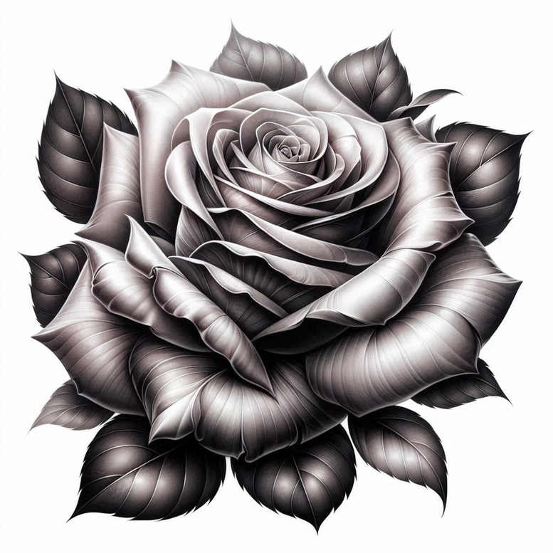 This piece presents a meticulously shaded black and grey rose rendered in a realistic tattoo style. A singular bloom unfolds with layered petals that transition from pale graphite edges to deep, near-black shadows, creating convincing depth and the feel of living petals. Surrounding leaves follow the same tonal gradient, their veins crisp yet softly blurred to maintain readability at typical tattoo sizes. The composition relies on smooth blending and fine line work to achieve a timeless look that reads clearly from a distance and up close. As a rose tattoo design, it works beautifully on the forearm, shoulder, or upper back, with the central bloom anchoring the piece and the leaves forming a natural frame that can be extended into additional blossoms if a larger sleeve or chest piece is desired. The realistic black and grey approach emphasizes form, light, and texture over color, using high contrast to define petal curvature and leaf texture while preserving a cohesive tonal balance across the design. This AI-generated tattoo project reflects current trends in fine line and grayscale realism, offering a high-quality reference that artists can adapt into a custom tattoo design tailored to client measurements. While the rose carries universal symbolism—love, renewal, resilience—the deep shading makes it especially suitable for cover-up work, where previous markings can be masked beneath bold black ink without compromising the flower’s legibility. For clients seeking meaningful tattoos, a single rose provides flexibility for small tattoos or a larger, statement piece. The piece aligns with black and grey traditions and contemporary approaches that favor durability and elegant line work. In sum, this dark, highly detailed rose render is a versatile foundation for a custom tattoo design that also serves well as a cover-up and a timeless body art motif.
