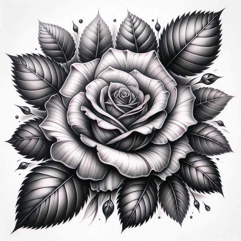 Emerging as a bold, high-contrast study in black and grey realism, this large rose centerpiece is framed by a careful spread of serrated leaves, creating a balanced composition that reads as a single cohesive tattoo design across the canvas of skin. Executed in smooth gradients and crisp edge work, the petals unfurl in multiple layers of charcoal shading, each fold catching subtle highlights that give the bloom a tactile presence and a sense of life. The surrounding leaves are rendered with a mix of heavy blacks and mid-tones, producing a graphic texture that anchors the design and ensures long-term readability. Although the image here is a concept, in practice this tattoo design translates well to a real project: clean lines, measured blackwork shading, and a composition that scales beautifully for placement on the upper arm, back, or chest. The piece nods to realism and traditional black-and-grey tattoo aesthetics while maintaining a timeless floral motif—rose tattoo design that embodies love, resilience, and transformation. For those seeking a meaningful tattoo with a strong silhouette, this concept offers an excellent foundation for a cover-up, especially if it replaces an older, darker piece; its dense shading makes it ideal for disguising previous ink. The shading strategy favors bold gradients over ultra-fine linework, preserving legibility and longevity on a larger canvas; if desired, additional motifs such as lotus flower tattoo or infinity tattoo could be integrated, but as shown it stands strong as a standalone flower tattoo. These notes reflect an AI-generated tattoo project—an exploratory concept that blends practical tattoo techniques with digital ideation, useful for clients pursuing custom tattoo design, black and grey realism, and meaningful body art in ink.