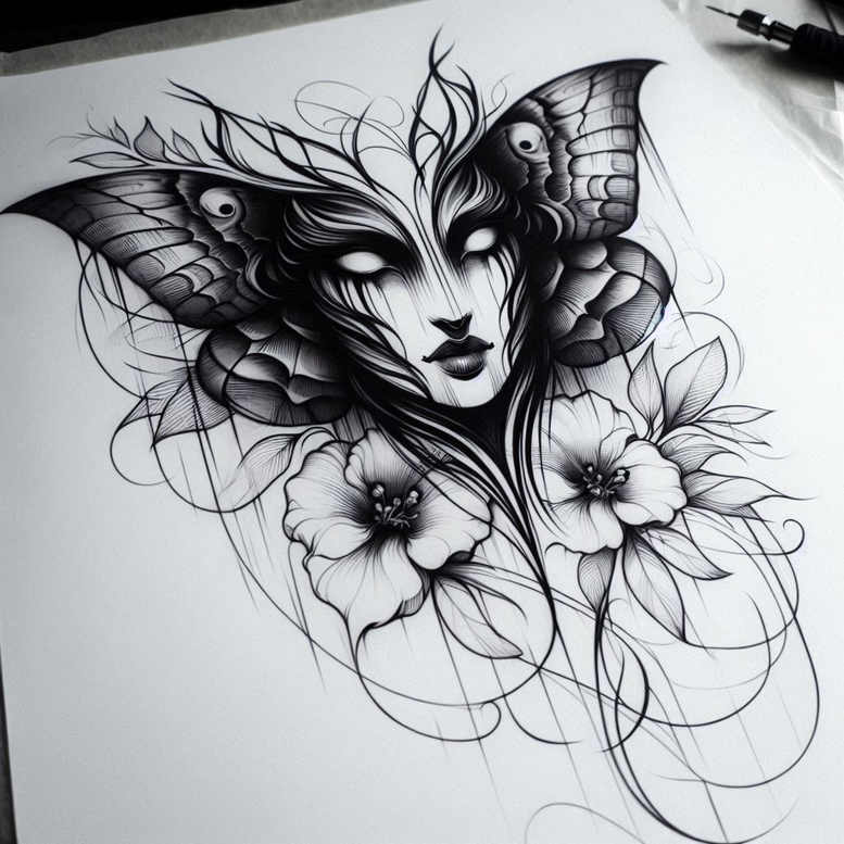 An AI-generated tattoo project presented here features a black-and-grey, fine-line tattoo design centered on a woman’s face, framed by butterfly wings and hibiscus-like blossoms. The sweeping linework merges organic strands with veined wings and petal shapes, built with cross-hatching and stippling to create a velvety grayscale texture. The composition moves from dense blacks in the wings and hair to lighter grays and thin threads, giving depth and movement as if the ink breathes. The symbolism of transformation (butterfly), femininity (face), and renewal (flowers) makes it a meaningful tattoo concept suitable for a variety of placements, from upper arm to back. As a pattern-rich piece, the graphic motifs form a cohesive, continuous design that can be scaled up or down, or used as a cover-up where older tattoos show through; the heavy shading allows concealing previous ink while offering strong new lines that reframe the skin as body art. This is an AI origin project, illustrating how generated tattoo concepts can inform real-world tattoo design workflows, from initial concept to refined, intra-skin execution. The tattoo design leans into timeless black and grey aesthetics, with fine-line technique anchoring the fragile grasses and petals, while the bold wings add contrast and drama. While not a direct lotus or infinity tattoo, the motifs borrow from classic themes of growth, resilience, and botanical beauty; the result is a versatile, collectible piece within the broader category of flower tattoos and Japanese-style linework, adaptable as a custom tattoo design that reads as both delicate and enduring, an ideal combination of art, ink, and personal meaning.