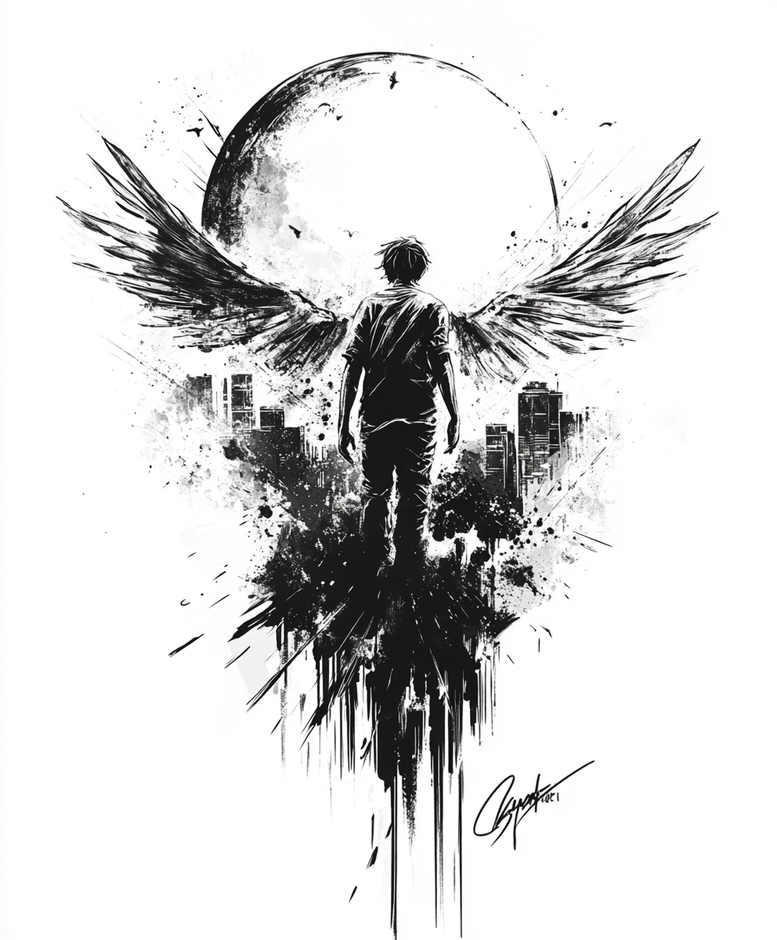 This AI-generated tattoo project presents a stark black and grey composition centered on a lone figure with outstretched wings, walking away toward a luminous moon. A city skyline dissolves into ink splatters beneath, crafted with bold brushwork, sharp silhouettes, and deliberate negative space to convey motion and depth. The wings anchor the piece as a symbol of ascent, protection, or escape, while the moon embodies cycles, illumination, and distant horizons. The fractured urban backdrop contrasts organic feathered forms, merging surreal imagery with contemporary city life—an evocative motif that can carry personal meaning for resilience, memory, or transformation. Executed in black and grey, the design relies on high contrast and textured shading rather than color to convey mood, making it versatile for placements ranging from forearms to sleeves or chest panels. The composition supports both fine line accents and stronger silhouettes, offering opportunities for dynamic line work and tasteful pattern integration. Symbolically, the pairing of a winged traveler and lunar light suggests guidance and inner strength amid urban pressures, a theme that resonates with meaningful tattoos and body art. For cover-up purposes, the dense blacks and layered textures can effectively obscure previous work while preserving a bold new narrative. This concept can be adapted into a realistic tattoo design or a stylized ink illustration, depending on client skin tone, line preference, and shading technique. As an AI-generated tattoo project, it demonstrates how digital brainstorming can inform traditional tattoo workflows, inviting viewers to explore a bold, timeless symbol through the lens of modern body art, ink, and Japanese-inspired linework sensibilities.