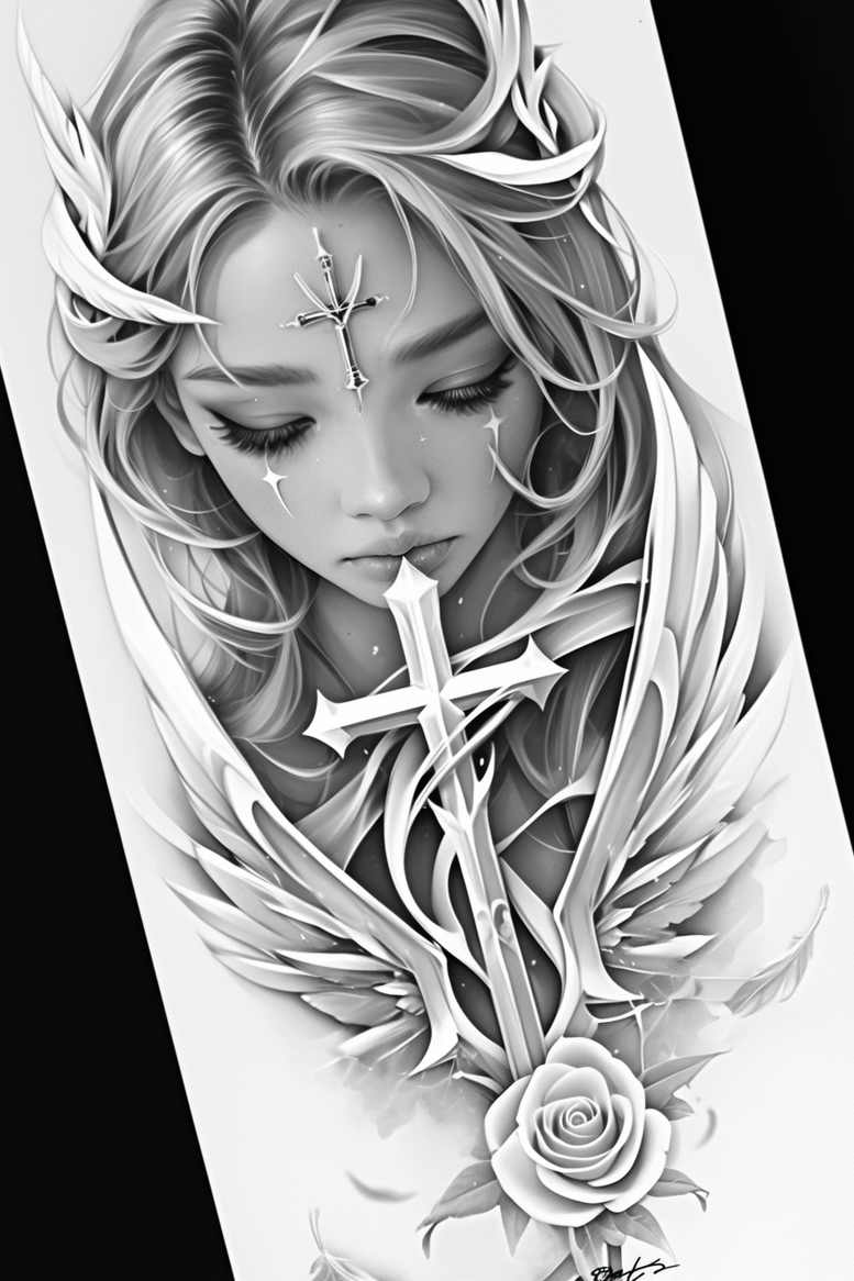 An AI-generated tattoo project presented as a highly detailed grayscale composition, this design centers on a serene female portrait framed by winged motifs, a cross-like cruciform element, and a blooming rose at the base. The shading uses smooth gradients to sculpt soft skin, hair strands, and delicate jewelry, while crisp edges emphasize the cross and blade that pass through the composition, suggesting faith, protection, and inner strength. The wings fan out in layered feather patterns, creating a vertical rhythm that guides the eye from the crown to the rose, where petals unfold with precise, almost architectural precision. This piece blends realistic black-and-grey portraiture with decorative patterning, delivering a bold yet refined tattoo design suitable for a large-scale sleeve or back piece, or even a selective placement for an effective cover-up. The monochrome palette—black and grey ink—provides a timeless contrast, allowing the figure’s expression and the sculptural cross to read clearly against negative space. The concept embraces symbolism: the portrait conveys introspection; the cross and sword evoke resilience; the rose anchors growth and renewal, while the winged elements lend movement and ascent. For collectors seeking meaningful tattoos, this design offers a custom tattoo design that can be adapted to Japanese style tattoo or realistic tattoo, with fine line detailing, strong line work, and smooth tonal transitions that preserve legibility as the piece scales. As an AI-generated tattoo project, it demonstrates how digital artistry translates into durable body art and ink, inviting tattoo artists to translate the cross, wings, and floral accents into exact line weights. In sum, the image presents a pattern-rich composition that fuses spiritual symbolism with contemporary aesthetics, offering a distinctive option for those considering a cover-up or a statement piece in black-and-grey ink, suitable for small tattoos or large canvases.