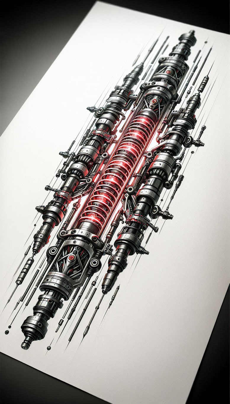 This piece presents a high-precision, sci-fi mechanical construct rendered as a tattoo design that sits at the intersection of industrial blueprint and body art. A center energy core glows red, serpentine coils wrapped by a lattice of cylinders, rods, gears and panels, all linked by slender wires that suggest motion and force traveling through metal. The line work is meticulous and clean, with crisp black ink defining each component and subtle shading to imply curvature and depth. The composition reads like a technical schematic yet remains highly legible as a tattoo, making it suitable for a sizable area such as the arm, back or chest where negative space can balance the dense machinery. The surrounding elements — bolts, screws, clamps and segments — create a rhythm of vertical strata that draws the eye along the central axis, giving the impression of a power conduit or reactor powering through skin. The red glow of the core provides contrast against the monochrome steel palette, enhancing visual impact while preserving a classic black and grey aesthetic that ages well with time. Interpreted as a symbol, the design can represent energy, resilience and transformation, appealing to wearers seeking meaningful tattoos that fuse technology with personal narrative. The piece leans into futuristic, industrial motifs but remains accessible as a contemporary tattoo design rather than a pure sci-fi illustration. As an AI-generated tattoo project, it demonstrates how algorithmic precision can translate into elegant line work and structured composition, offering an approach for clients who value a pattern-rich, geometric aesthetic. In terms of style and technique, the design aligns with a fine line tattoo sensibility while embracing a realistic tattoo quality through controlled shading and crisp edge definition.