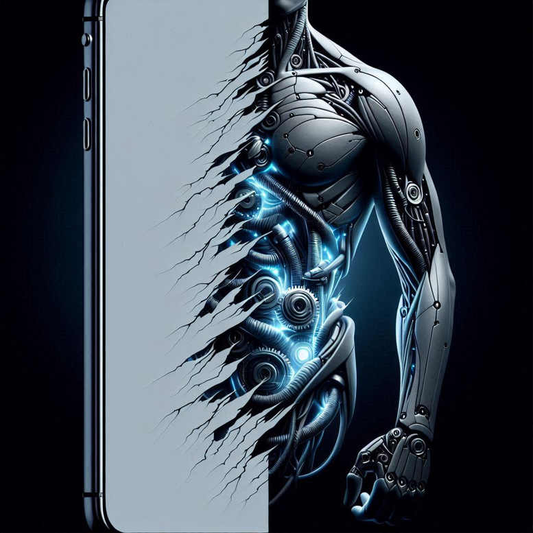 This ultra-detailed biomechanical concept merges anatomy with machine as an arm and hand reveal a network of gears, pistons, and glowing blue circuitry. The design is split by a smartphone edge, with the left panel appearing as a blurred screen and the right side carved into metal plates and cables, creating a dramatic contrast between organic and synthetic textures. Executed in a hyper-realistic style with fine-line precision, the piece employs crisp linework, smooth gradients, and strategic white highlights to simulate chrome reflections and the glow of circuitry. The color palette centers on black and grey base tones, punctuated by electric blue luminescence and silver metallic surfaces to accentuate depth and function. The motif of exposed machinery conveys themes of strength, resilience, and digital-age identity, while the ambiguous boundary between device and flesh invites contemplation of technology’s encroachment on the body. This tattoo design leverages a custom tattoo design approach, enabling it to scale from a compact forearm piece to a larger sleeve, and its dense pattern of gears and circuits makes it an excellent candidate for a cover-up on older tattoos.