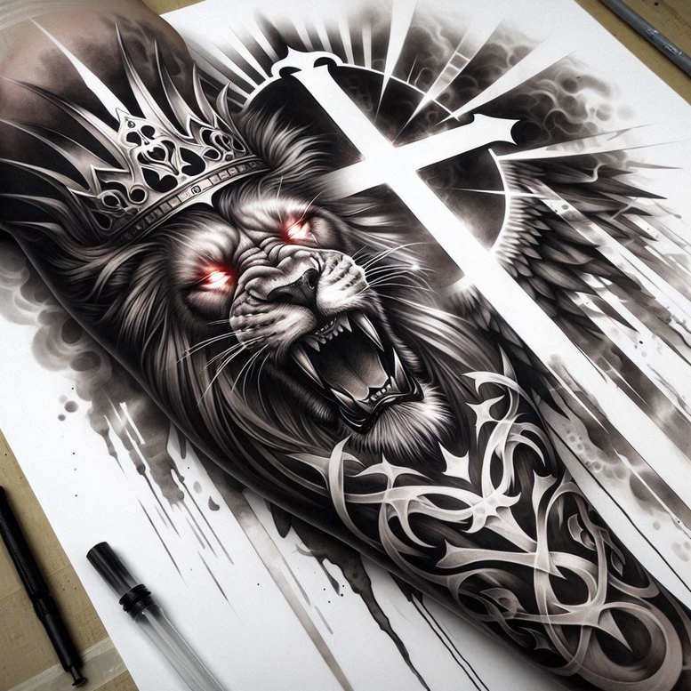 This AI-generated tattoo project presents a hyper-detailed black and grey lion design crowned and roaring, anchored by a stark cross and sweeping wing motifs. The composition blends realism with ornamental pattern work, employing smooth gradients, fine line shading, and deliberate negative space to achieve depth across a large canvas such as the chest, back, or sleeve. The central lion’s head is sculpted with snarling jaws, bared teeth, and eyes rendered as glowing red orbs that contrast sharply with the monochrome palette, emphasizing intensity and focus. The crown perched above the brow marks sovereignty, courage, and leadership, while the cross behind the head acts as a bold architectural element that guides the eye through the design, its stark white against black ink creating a dramatic focal point. Wing-like shapes radiate outward, suggesting movement and protection, while surrounding filigree and scrollwork weave around the beast, adding rhythm and texture. The overall style sits firmly in black and grey realism, yet the graphic elements—sharp edges, high contrast, and measured splashes—inject a contemporary edge that suits modern body art trends. For the wearer, this tattoo design can function as a powerful symbol of protection and strength, making it meaningful for those seeking meaningful tattoos, and it translates well into a cover-up scenario thanks to dense shading that can mask older ink or scar tissue. From a technique standpoint, it offers practitioners a robust exercise in layering, contrast control, and precision line work, with potential for subtle fine-line accents or broader shading to suit individual anatomy. The design references classic motifs while its composition echoes influences from Japanese style tattoo and tribal aesthetics in its silhouette and flow, yet remains anchored in the universal language of lions as guardians. As an AI-generated tattoo project, it demonstrates current capabilities in producing complex tattoos that blend realism with graphic patterning, and it presents a bold, timeless option for those seeking a strong, memorable tattoo design, suitable for both large pieces and future expansions in ink.