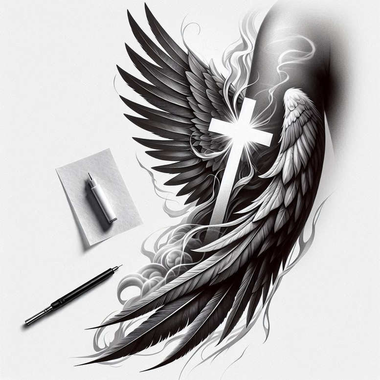 Presented as an AI-generated tattoo project concept, this design pairs a bold cross with a sweeping angel wing rendered in black and grey. The central cross acts as a bright focal point, its clean geometry contrasting with the fluid plumes of the wing, which curve around the arm in a motion that suggests ascent and protection. The shading varies from velvety black to soft grey washes, creating depth and a sense of movement within the detailed featherwork. Smoke-like wisps weave beneath the wing, helping to integrate the piece with the skin and offering a cohesive flow that works well for larger panels or as part of a sleeve. The composition is anchored by a restrained palette, so the tattoo remains readable at smaller scales, while the negative space around the cross adds drama. The image includes a pen and paper on a light background, signaling this as a concept sketch or a custom tattoo design ready for client translation. Although imagined in a digital medium, the rendering emphasizes traditional tattoo considerations: line weight, contrast, placement, and the interplay between solid black areas and delicate fine lines. The wings carry a graphic feather pattern with careful attention to feather layering, rachis definition, and subtle feather texture that makes it suitable for a realistic black and grey approach. Symbolically, the cross evokes faith and protection, while the wing suggests ascent, freedom, and guidance; together they form a meaningful tattoo design for someone seeking a statement piece with personal symbolism. Because the piece leans toward dark tones, it is particularly well suited for a cover-up, allowing a practitioner to layer new ink over an existing mark with confidence. This concept integrates keywords important to discovery in tattoo culture—tattoo, tattoo design, meaningful tattoos, fine line tattoo, lotus flower tattoo, infinity tattoo, tribal tattoo, rose tattoo design, small tattoos, flower tattoos, custom tattoo design, Japanese style tattoo, black and grey, realistic tattoo, body art, ink—while maintaining a clear focus on a winged cross motif that reads well on the skin.