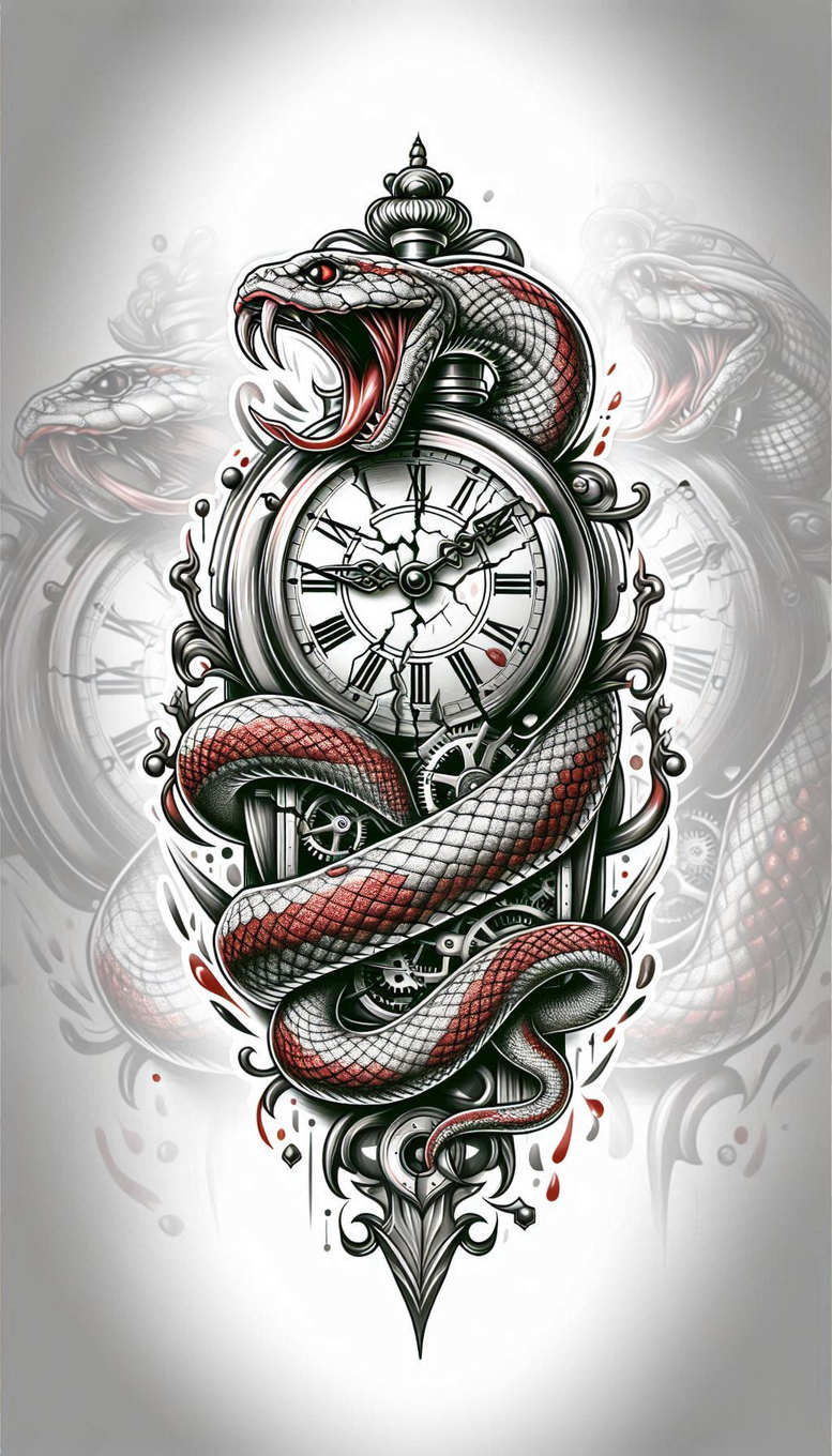 An intricate clock-and-snake tattoo design rendered in black and grey with red accents, this piece fuses mechanical precision with living motion in a vertical composition ideal for the back, chest, or sleeve. A vintage pocket watch anchors the motif, its cracked enamel dial and Roman numerals rendered with fine line shading to recreate the cold gleam of metal. A sinuous snake coils around the timepiece, its scales built with dense cross-hatching that yields a tactile, three-dimensional texture, while the head arches above the dial with a sharp red eye and a hint of crimson along the scales to intensify the drama of time’s grip. Surrounding the clock is a swarm of gears, cogs and ornamental filigree that interlock into a pattern-like lattice, creating rhythm and depth and giving the sculpture-like design a cohesive reading on skin. The artist balances strong black ink with smooth gradients and precise white highlights to convey glass, metal, and skin texture with a convincing realism that supports a wide range of placement, from forearm to torso. Although rooted in timeless symbolism—time, vigilance, transformation—the technique leans into contemporary tattoo practice: edge-to-edge line work, bold black shading, and controlled negative space that preserves legibility as the piece ages. This is also an AI-generated tattoo project, illustrating how modern algorithms can inspire tattoo design while honoring artisanal craft. For those seeking a credible cover-up, the dense blacks and complex patterning provide substantial ink coverage while the red accents serve as a vivid focal point. The pattern-filled arrangement of mechanical elements, combined with serpentine movement, invites cross-cultural references—from Japanese style motifs to Victorian chronometers—ensuring the final tattoo design remains versatile across styles. In sum, the clock and snake entwine time, resilience, and rebirth in a visually commanding composition that rewards close inspection with fine line detail, intricate shading, and meaningful tattoo symbolism, while remaining a strong candidate for a lasting, meaningful ink that travels well into future body art.