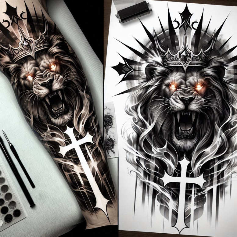 This AI-generated tattoo project presents a nocturnal, high-contrast lion motif designed for bold skin canvases. The central figure is a snarling lion head crowned with an ornate diadem, its mane cascading into razor-sharp, graphic spikes that cradle a cross-inspired glyph at the chest. Deep black and grey shading builds volume in the lion’s muzzle, mane, and the crown’s facets, delivering a striking sense of realism and motion on a single-panel canvas. The eyes glow with intensity in the darker rendering, enhancing the feral gaze that anchors the composition. While the right-hand rendering reads as a dense ink study, the pair demonstrates how a concept can function both as a bold standalone tattoo and a potent cover-up for existing ink. This is an AI-generated tattoo project, exploring a graphic, pattern-driven aesthetic that blends realism with geometric rhythm, well-suited for larger sleeves or back pieces. The design centers on the lion’s fierce visage, regal crown, and a cross motif, with elongated, radiating elements that create movement and drama. In the broader context of tattoo design, it stands as a custom tattoo design that embraces black and grey realism as a modern body art signature. For collectors seeking meaningful tattoos symbolizing strength, courage, and leadership, this piece delivers a dramatic narrative while remaining adaptable for both small or expansive canvases. The composition leverages negative space and linear motifs to achieve balance between explicit imagery and abstract patterning, inviting personalized refinements. Keywords: tattoo, tattoo design, meaningful tattoos, black and grey, realistic tattoo, body art, ink, custom tattoo design, Japanese style tattoo, tribal tattoo, rose tattoo design, fine line tattoo, infinity tattoo, lotus flower tattoo.