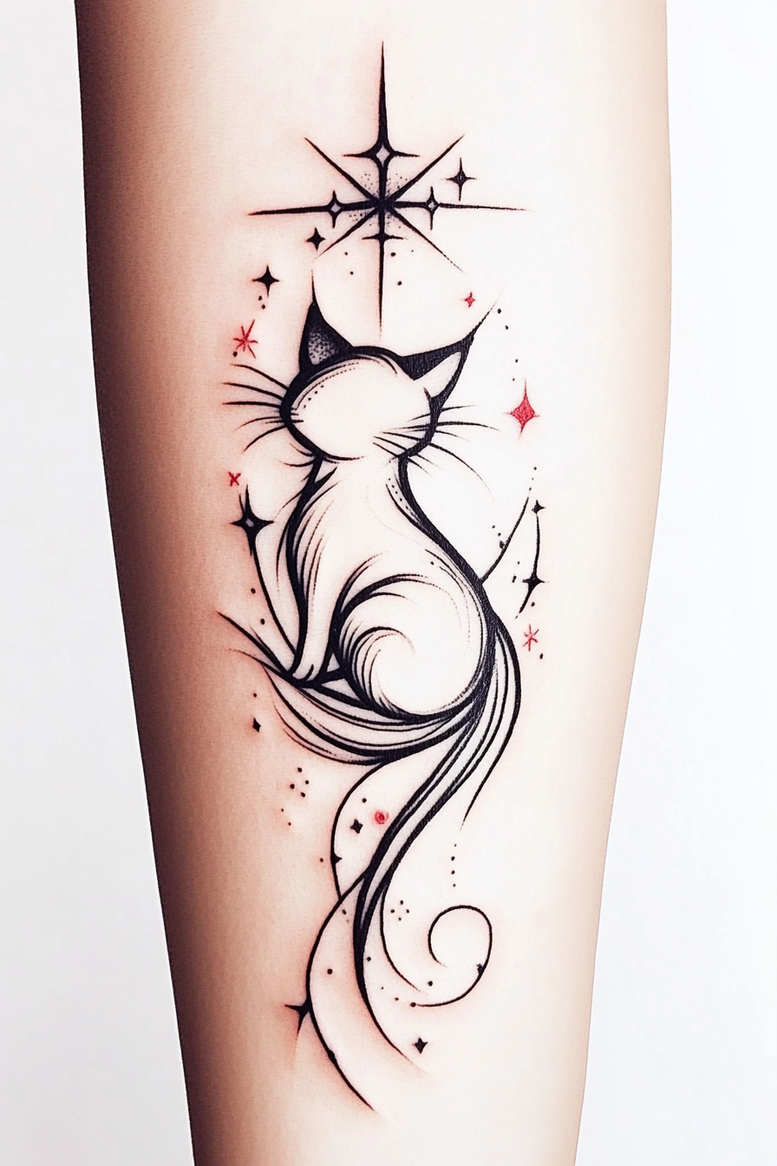 This forearm tattoo design presents a cat silhouette drawn in flowing black lines, its arched back and curling tail weaving through a constellation of starburst accents and scattered specks. Executed in black ink with selective shading, the piece relies on fine-line technique to convey motion, elegance, and a touch of whimsy without heavy fill. The composition uses negative space to keep the feline form airy while the stars act as a celestial halo, adding shimmer around the silhouette. A few red highlights on select stars introduce a controlled contrast that can be kept, muted, or removed for a fully monochrome look. Symbolically, the cat suggests independence, curiosity, and subtle mystery, while the starry surroundings evoke guidance, dreams, and personal aspiration—making this a meaningful tattoo for someone who values narrative and timeless design. Described here as an AI-generated tattoo project, the concept reflects contemporary digital-to-ink artistry and is well suited to a custom tattoo design workflow, where line weight, spacing, and placement can be tuned for a precise forearm fit. Perfect for small tattoos or a delicate centerpiece within a larger sleeve, the piece remains adaptable, scalable, and enduring in black and grey ink. It aligns with trends in fine-line tattoo, minimalist body art, and meaningful tattoos, while offering flexibility for color tweaks or pattern-free execution. The result is a refined silhouette with crisp line work, balanced composition, and a stylish, enduring look that translates well across ages and skin tones. Careful line quality and consistent ink saturation will help ensure the design ages gracefully, preserving the legibility of the fine lines and the sparkle of the stars.