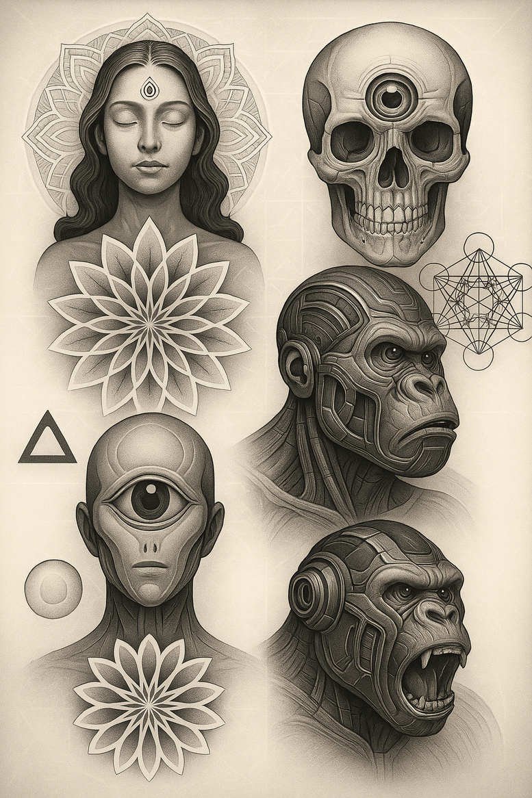 AI-generated tattoo project presented here showcases a carefully composed vignette that blends symbolic imagery with a modern, grayscale realism. The central figure is a serene woman, rendered in soft shading with a mandala halo implied by delicate radial geometry, while a bold lotus motif sits over the chest as a symbol of spiritual growth in lotus flower tattoo design. To her side and across the page, a skull peers from the upper right, and a powerful robotic gorilla face anchors the lower right, both rendered with meticulous line work and tonal value that emphasize texture—bone, metal, and sinew coexisting in a single composition. A cyclopean alien head appears on the lower left, its single eye a focal point that invites contemplation about perception and the unknown. Subtle geometric motifs drift through the array—a triangle and a circle suggest balance and unity, while a larger geometric network on the right adds a sense of cosmic order. The overall piece reads as a study in contrast: human softness versus machine precision, ancient symbolism versus futuristic form, black and grey shading that folds into smooth gradients and crisp line micro-details. Despite its complexity, the design remains coherent and adaptable as a cover-up tattoo; its bold silhouettes and dense tonal ranges can effectively mask previous marks while preserving meaning. The AI-generated nature of this project highlights contemporary exploration in tattoo design—an approach that merges traditional iconography with speculative aesthetics. The motif selection nods to popular categories such as lotus flower tattoo design, fine line tattoo details, and a subtle nod to Japanese style shading without explicit references, making it suitable for meaningful tattoos that still maintain a modern edge. For practitioners, this composition offers a versatile template: a large, central figure balanced with secondary elements, opportunities for gradient shading, and interchangeability of motifs to suit limb, back, or chest canvases. In short, this is a cover-up-ready tattoo design that marries symbolism with technical execution, a thoughtful fusion of art and ink that can anchor a narrative across a broad spectrum of body art language.
