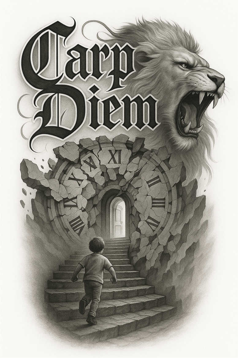 This AI-generated tattoo project presents a cover-up-ready, highly detailed black-and-grey piece that fuses emblematic symbolism with a bold typographic statement. Dominating the composition is a roaring lion head, its mane rippling across the upper field while the words Carpe Diem appear in ornate Gothic lettering, announcing a philosophy of seizing the day. Beneath the text, a fractured circular clock disrupts the ground, its Roman numerals scattered as if time itself collapses into rubble, while a doorway arches at the clock’s center and a stairway leads the viewer’s eye toward that luminous portal. A lone child ascends the steps, providing a human focal point and inviting personal interpretation about memory, innocence, and the journey through time. The surrounding rocks and debris function as a graphic pattern, adding texture and rhythm to the scene, and transforming the piece into a cohesive composition rather than a simple collage of symbols. This tattoo design is executed in pencil graphite shading, with smooth gradient transitions that render volume, skin tone, and the interplay of light on fur, stone, and metal. The black and grey palette emphasizes mood and drama and makes the image suitable for meaningful tattoos, large-scale placements, and as a showpiece for chest or back work. The technique emphasizes controlled line work and subtle layering to achieve a realistic look, while the Gothic typography and the clock motif ground the piece in tradition. Interpreting the symbolism, the lion evokes strength and leadership, the phrase Carpe Diem reinforces urgency, the shattered clock embodies the fragility of time, and the doorway offers a path forward into possibility. The result is a versatile, modern tattoo design that nods to Japanese style tattoo aesthetics through its composition and shading, yet remains firmly within the black and grey realism tradition. For clients seeking a cover-up, the dense shading and negative space around the lion and clock create opportunity to obscure older tattoos while preserving the new artwork’s impact.