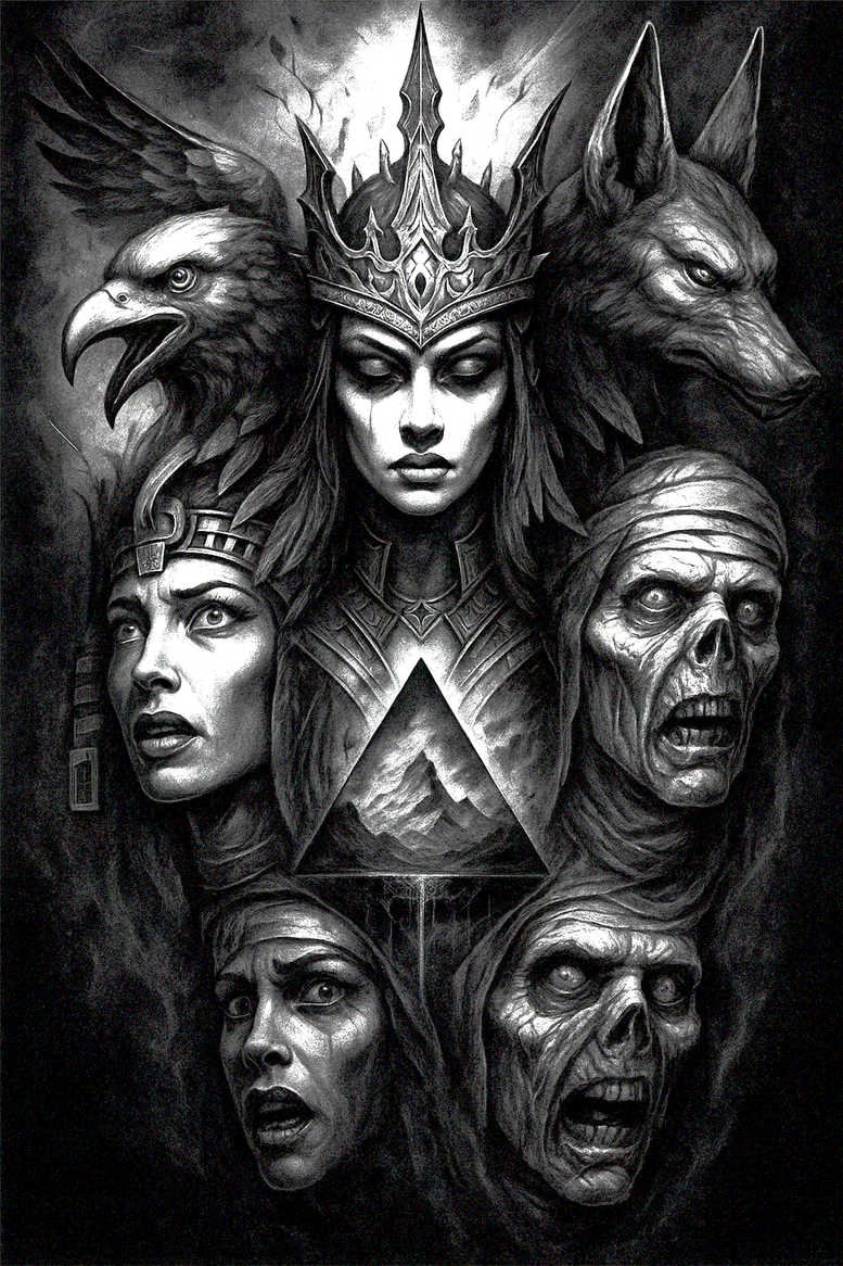 This AI-generated tattoo project presents a dramatic black-and-grey composite centered on a crowned queen, her eyes calm as an eagle on the left and a wolf on the right flank her, while a gaunt skull and distressed faces anchor the lower band, and a geometric triangle motif resembling a mountain silhouette sits at the chest as a unifying emblem. The composition relies on layered shading, high-contrast transitions, and precise line work to render fur, feathers, bone, and skin with tactile realism. The crown and armor carry ornate filigree, creating a mythic frame that ties the figures together into a single, coherent narrative about sovereignty, danger, and mortality. The central queen symbol suggests rulership over chaos, while the eagle and wolf evoke freedom and ferocity; the skull and the haunted faces introduce time, memory, and impermanence, inviting viewers to interpret how strength and vulnerability coexist within one body art concept. The triangle motif functions as a geometric anchor, providing negative space around the ensemble and guiding the eye through the vertical composition, making it a strong candidate for back, chest, or sleeve placements. The piece works well as a multi-session project, with room to adjust scale, shading depth, and line density to suit a client’s anatomy. As an AI-generated tattoo project, it demonstrates how digital artistry can translate into meaningful tattoos while respecting traditional technique, and it embraces a modern approach to dark fantasy ink. Technically, the work leverages black-and-grey shading with smooth gradients, crisp line work for the crown and armor, and textured rendering for feathers, fur, bone, and skin. The pattern-like arrangement creates a rhythm across the design while preserving clear individuality for each figure. Overall, this tattoo design embodies a bold, narrative-driven aesthetic that can function as a striking standalone piece or serve as a powerful cover-up option for those seeking to hide prior work. ink.