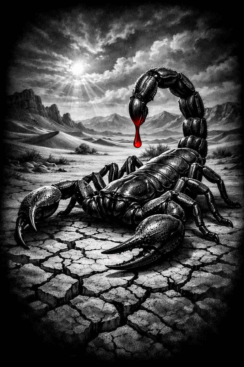 Generated as an AI-assisted tattoo concept, this black and grey realism design centers on a formidable scorpion anchored on a fissured desert ground. The creature is rendered with meticulous chiaroscuro: the carapace, legs, and pedipalps are built from feathered gradients, while the joints appear as crisper lines to convey anatomical accuracy. The abdomen blooms into darker sooty tones that dissolve into the surrounding skin with subtle graduation, and the tail arcs overhead in a poised, warning curve, its sharp stinger poised to strike. A deliberate drop of red at the tip provides a crash of color in an otherwise monochrome field, drawing focus without breaking the tonal harmony. The cracked ground beneath is treated as a secondary character: irregular fissures, micro-scratches, and stippled shading create depth and imply a harsh environment, enhancing contrast against the smooth, sculpted form of the scorpion. The sky behind is rendered as a dramatic gradient, with faint cloud textures and a luminous edge that silhouettes the figure and compresses space, making the subject read large on skin. The composition relies on bold silhouette, negative space, and a careful balance of light and shadow to ensure readability from afar, while retaining fine detail up close. The design leverages large black masses and selective midtones to support a compelling cover-up option for older tattoos, harnessing the power of dark areas to mask underlying marks. As an AI-generated concept, it demonstrates how digital generation can inform traditional tattoo planning, translating precise linework and shading into a flexible stencil ready for adaptation to forearms, calves, shoulders, or backs. The motif of the scorpion evokes protection, resilience, and the desert’s unforgiving terrain, while the red accent signals danger and vitality, inviting interpretation about personal struggle, timing, and boundaries. Overall, the piece merges realism with dramatic composition, offering a visually striking, long-lasting tattoo design that remains clear and legible as a stand-alone work or as a cover-up solution.