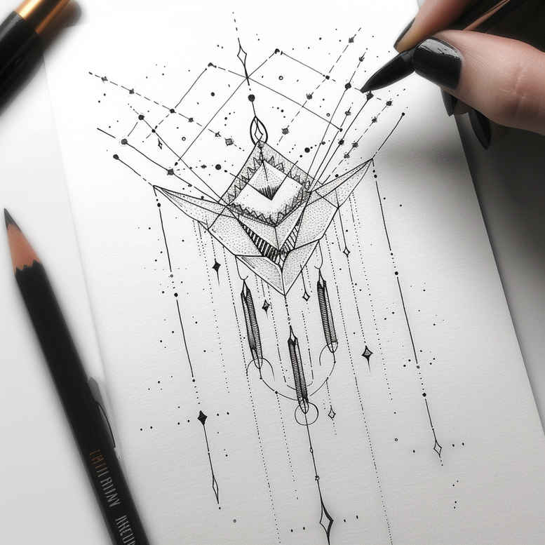 Lotus flower with decorative lines and pencil sketch; black and grey, project idea for a tattoo design; not ideal for cover-up.