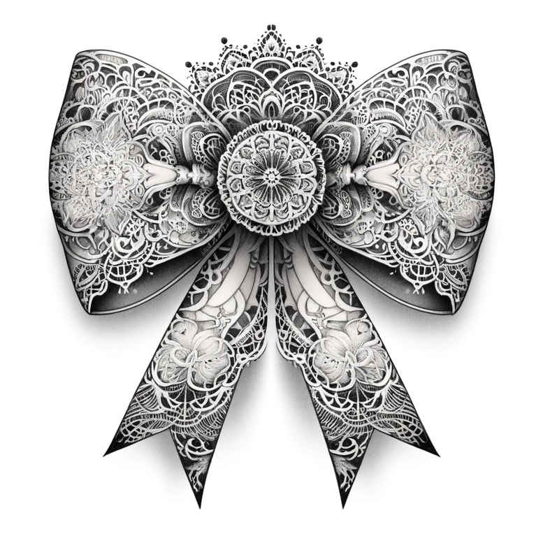 An AI-generated tattoo project concept featuring an ornate lace bow rendered in black and grey. The design fuses meticulous lace filigree with bold ribbon geometry, achieving harmony between negative space and dense linework. Executed in fine line technique, the piece emphasizes delicate, repeating mandala-inspired motifs radiating from a central knot, with scalloped edges and ribbon tails that taper into sharp points. The grayscale shading builds depth through smooth gradients and stippled textures, giving the form dimension while preserving a cohesive monochrome aesthetic suitable for a wide range of skin tones. The motif serves as a versatile focal point for placement along the nape, shoulder blade, or upper back, and its structured symmetry renders well as both a compact tattoo and a larger composition that can evolve with future additions. Because of the heavy pattern-work, the design offers a compelling option for cover-up applications, where the lace can obscure existing ink while transforming it into a unified, decorative piece; the interplay of light and shadow helps to blur previous lines rather than compete with them. The concept envisions a tattoo design that is decorative yet meaningful, with lace symbolism implying patience, refinement, and the interweaving of fate, while the bow motif adds a sense of elegance and restraint. The project uses black and grey ink to emphasize texture, shadow, and form rather than color, aligning with current ornamental and fine-line tattoo aesthetics and with Japanese-inspired restraint. As an AI-generated tattoo project, it probes geometry, symmetry, and botanical lace motifs within a single cohesive composition, inviting a bespoke interpretation by an artist. Key elements highlighted include the central bow, ornate lace filigree, mandala-esque radiance, and tapered tails that anchor the design; the work offers a timeless silhouette that appeals to fans of small tattoos, flower-inspired motifs, and those seeking a meaningful, custom tattoo design with enduring appeal. AI-generated tattoo project note included to acknowledge origin.