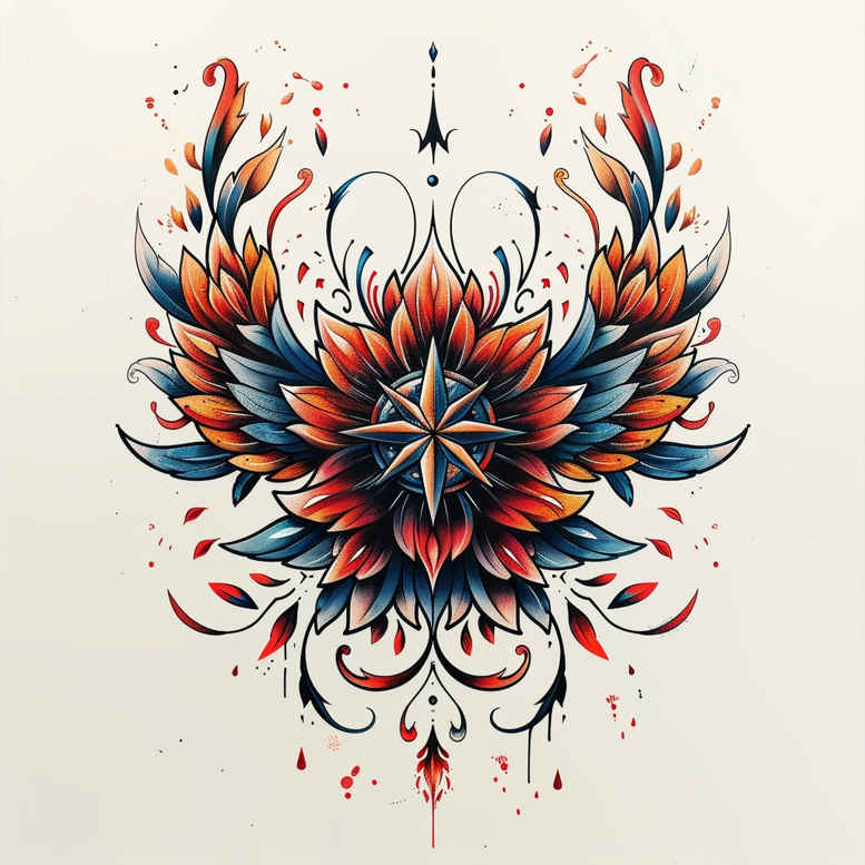 AI-generated tattoo project concept presents a colorful floral mandala crafted for modern body art readers. The design centers on a sharp, star-like core surrounded by multiple, overlapping petals that radiate in perfect symmetry, while curling swirls and dotted accents weave a lace-like frame around the composition. The line work is precise and fine, allowing crisp outlines to hold strong against saturated color fills. The palette emphasizes red and orange hues on the petals with cobalt blue and black accents, creating a high-contrast, dynamic appearance that reads clearly from a distance and up close. Symbolically, the lotus-inspired petals convey purity and growth, while the mandala structure embodies balance, unity, and eternity, making this a thoughtful option for meaningful tattoos. The piece is designed with versatility in mind: it can anchor a larger forearm or back piece, yet scales gracefully for smaller placements if reduced, preserving its center-to-edge harmony. Techniques emphasize clean line work, smooth gradient transitions, and subtle shading to maintain legibility across sizes, with attention to how color saturation interacts with skin tone. Key elements include the central star motif, layered petals, decorative swirls, and dotted accents—all organized into a cohesive, eye-catching pattern that works well as a standalone piece or as part of a larger tapestry. This tattoo design aligns with contemporary Japanese style tattoo aesthetics through its ornamental symmetry while remaining adaptable to various style influences like traditional floral and fine-line approaches. It is an AI-generated tattoo project concept that demonstrates how bold color can elevate fine-line work to produce a striking flower tattoo design suitable for fans of meaningful tattoos, lotus flower tattoo motifs, and flower tattoos alike; the result is well-suited for ink applications as a custom tattoo design, and reads effectively in both black ink outlines and color.