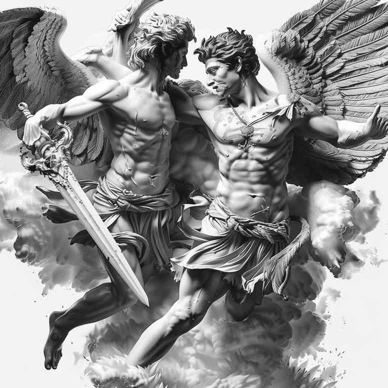 This AI-generated tattoo project concept presents a dramatic, black and grey scene of two winged warriors engaged in a duel, rendered in bold linework and subtle shading that invites a contemporary fine line tattoo sensibility. The composition positions the figures in stark contrast, each gripping a sword as wings spread wide, with chiseled physiques and determined expressions that communicate resolve and protection. A turbulent cloudscape behind them provides atmosphere while leaving negative space that can be leveraged for skin aging and contrast. The piece emphasizes strong blacks and mid-tone greys to create depth, allowing a tattoo artist to adapt line weight for different placements, from small tattoos to full-sleeve designs. This tattoo design reads as a meaningful tattoo concept about duality, courage, and celestial guardianship, yet remains versatile enough to fit a Japanese style tattoo or a more realistic black and grey approach. From a practical perspective, the design works well as a cover-up due to dense shading and overlapping silhouettes that can mask older ink, while also offering opportunities for personal symbolism, such as pairing with a lotus flower tattoo to signify enlightenment, or an infinity tattoo to anchor a larger narrative. For the client seeking a bold statement, the two figures can be stylized or rendered with enhanced detail, and the piece can be scaled without losing clarity, making it suitable for small tattoos, medium work, or a dramatic back piece. The concept also nods to traditional tribal tattoo rhythms in the rhythm of the lines and the balance of positive and negative space, while staying grounded in a modern, black and grey realism ethos. Overall, this tattoo design embodies classic body art ideals: commitment to craft, meaningful tattoos, and the flexibility to evolve into a bespoke piece that a studio can execute with precision, ensuring a timeless, ink-worthy result. It is intentionally crafted as a cover-up friendly concept for clients looking to replace or conceal existing work with a striking mythic scene.