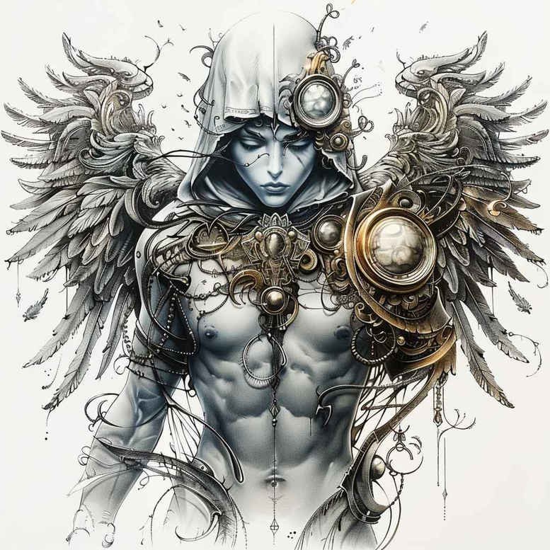 AI-generated concept presents a high-contrast fantasy figure: a muscular, winged warrior rendered in black and grey ink. The composition centers on a towering torso, bold pectorals, and a stern facial expression framed by a helm-like headpiece, with two expansive wings unfurling from the back. Ornate armor accents circle the shoulders, and circular orbs and filigree motifs weave through the straps, creating a dense, pattern-rich surface that invites close inspection. The sculptural anatomy is rendered with a blend of precise linework and soft shading to achieve a sense of three-dimensional form on skin, characteristic of a realist black and grey tattoo aesthetic. This project emphasizes contrast: pure black fills anchor the silhouette while delicate crosshatching and fine lines add texture to metal, feathers, and skin. While the figure exists as a standalone image, its density and coverage make it an excellent candidate for a cover-up task, capable of concealing older ink beneath heavy shadow and layered tone. For clients seeking meaningful tattoos, the design can symbolize protection, ascent, or duality—wings suggesting freedom, armor representing resilience, and the juxtaposition of light and dark across the chest and back. The piece aligns with traditional tattoo design motifs while embracing contemporary illustration techniques; it pairs well with timing choices from Japanese style tattoo influences to modern, bold black and grey execution. Suitable for larger formats and statement pieces, this tattoo design transcends simple decoration and becomes a narrative body art piece. Keywords include tattoo, tattoo design, meaningful tattoos, fine line tattoo, lotus flower tattoo, infinity tattoo, tribal tattoo, rose tattoo design, small tattoos, flower tattoos, custom tattoo design, Japanese style tattoo, black and grey, realistic tattoo, body art, and ink. If a cover-up is a goal, the composition’s density and the deep shadows provide ideal planning latitude for blending with existing tattoos, without compromising the new design’s drama.