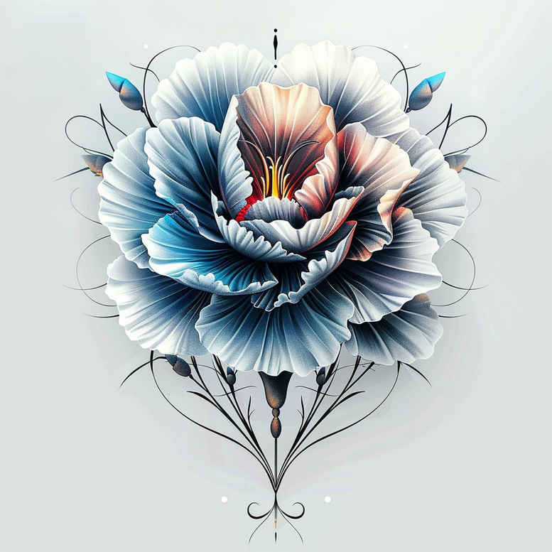 This AI-generated tattoo project presents a blue peony-inspired bloom rendered in a clean fine-line approach with subtle shading and an ornamental base. The central element is a lush blue peony with rich gradients from cobalt to cerulean, outlined in crisp black line to anchor the form on light skin. Surrounding the bloom are delicate petals, a slender vine network, and a symmetrical filigree motif that descends into a decorative foundation, creating a pattern that can be extended into larger compositions. The design balances a bold focal point with ample negative space, making it suitable for small tattoos in places like forearm or wrist, while easily scaling to a full sleeve if the client desires. The style nods to Japanese style tattoo aesthetics with restrained color and precise linework, while keeping the palette firmly blue and grayscale accents to preserve legibility over time; the effect reads as a black and grey with blue accents, aligning with current trends in realistic tattoo shading. From an ink perspective, the piece relies on fine-line technique, controlled gradient shading, and stippling to give the petals depth without crowding the composition. Meaningfully, the peony is a symbol of prosperity and resilience, and the intertwined vines suggest growth and continuity, making this a meaningful tattoo design for someone seeking beauty with a quiet, enduring message. While envisioned as a standalone image, its pattern-based structure invites expansion—be it a lotus flower tattoo or infinity tattoo motifs joining for a larger piece—and can be adapted into tribal or modern Japanese-inspired body art, all in service of a custom tattoo design that remains elegant in both color and line. AI-generated tattoo projects like this expand the repertoire of contemporary ink concepts and offer guidance for clients exploring floral motifs in small to mid-sized formats, including rose tattoo design and other flower tattoos as potential future additions.