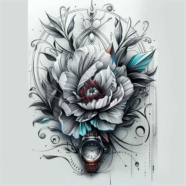 An AI-generated tattoo project concept presenting a bold yet delicate composition centered on a lotus blossom and a skull, rendered in fine line technique with meticulous shading. The grayscale lotus is carved with slender lines and subtle dotwork to create depth, while teal accents punctuate the center and edges, offering a modern pop of color against the monochrome base. Beneath the bloom sits a stylized skull motif, anchoring the design with a contrast between life and mortality that invites personal interpretation—meaningful tattoos often carry such dualities. Surrounding ornamental swirls and decorative patterns weave through the composition, establishing graphic patterns that enrich texture and movement. This tattoo design blends elements of traditional black and grey realism with contemporary linework, and its dense shading makes it particularly suitable for a cover-up of existing work. The piece reads as both a standalone art study and a potential larger back or chest piece, scalable in size for small tattoos or for expansion into a full sleeve. From a technique perspective, the approach favors clean line precision, soft gradient shading, and controlled contrast to maximize longevity on skin while preserving fine line fidelity. The lotus flower tattoo symbolism evokes purity, rebirth, and spiritual awakening, while the skull implies mortality and endurance, making the overall design deeply personal. Crafted as an AI-generated tattoo project, this concept embraces trends in modern ink without sacrificing classic motifs, accessible to clients seeking a custom tattoo design with a Japanese style influence or a botanical silhouette with a tribal edge, rendered in black and grey with selective color. It also appeals to collectors of flower tattoos and small tattoos seeking meaningful tattoos with a strong focal point and flexible placement, ensuring the artwork remains legible and elegant when resized. The result is an ideal starting point for a commission that marries traditional symbolism with contemporary aesthetics; it reads well in black and grey, remains crisp in ink, and invites stylistic interpretation while staying faithful to the core motifs of lotus, skull, and ornamental pattern.