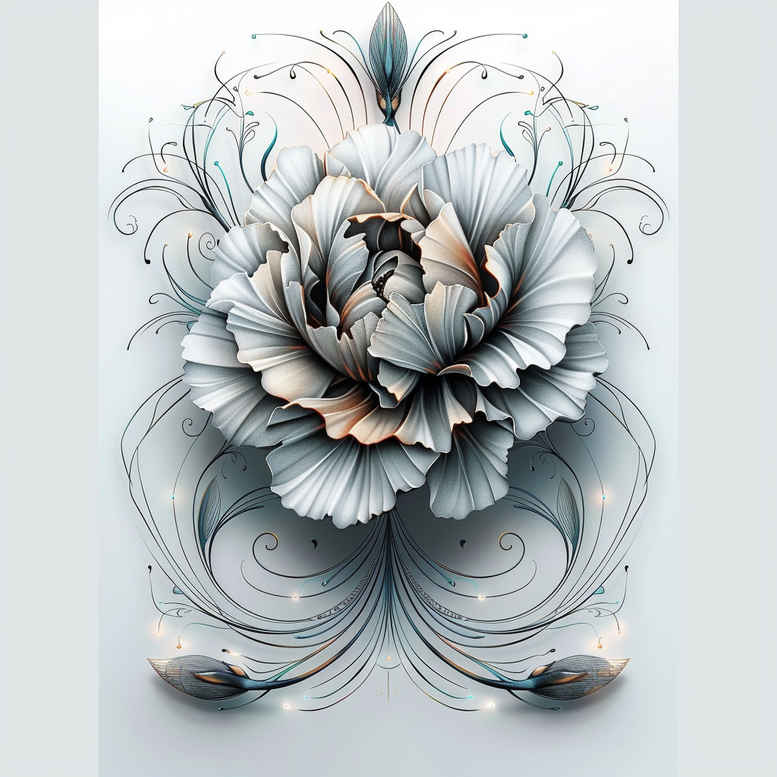 An AI-generated tattoo project concept presenting a lotus bloom in a refined black and grey palette. The central lotus unfolds with multiple layered petals, each petal shaded to create soft dimensionality, while delicate linework swirls radiate outward like water currents, emphasizing movement and balance. Blue teardrop accents punctuate the edges, adding a cool highlight that contrasts with the monochrome shading. The composition sits against a light background, making the flower the focal point and guiding the eye toward the center. The lotus carries symbolism of purity, spiritual awakening, and resilience, themes frequently explored in lotus flower tattoo design. The petals’ edges and the surrounding arabesques are drawn with fine line technique to support a classic fine-line tattoo aesthetic, suitable for both small tattoos and larger back or sleeve concepts. This concept can be adapted into a Japanese-style motif or blended with Western floral imagery, potentially incorporating infinity symbols or subtle tribal elements if desired. It can also inspire a rose tattoo design option for clients seeking alternative floral symbolism. As a comprehensive tattoo design concept, it demonstrates how variations in line weight, soft shading, and decorative patterns can yield a timeless piece of body art. The blue accents offer a restrained color note that remains harmonious with the black and grey base, ensuring longevity of the tattoo when placed on skin. For clients seeking meaningful tattoos, this lotus composition delivers clarity and elegance that suits modern and traditional sensibilities alike. While the image is AI-generated, it translates well to a high-quality tattoo project for skin; it can be scaled for small placements or extended into larger canvases. In sum, the piece blends realism in shading with ornamental pattern work, making it a versatile option for a cover-up or a standalone work, and it illustrates why this motif continues to resonate in contemporary tattoo culture.