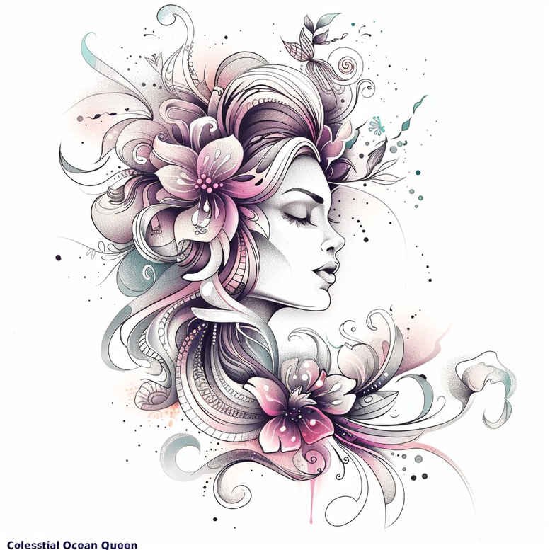 AI-generated tattoo project concept featuring a refined profile of a woman adorned with floral motifs in her flowing hair. The line work is delicate and intricate, characteristic of fine-line tattoo technique, with crisp outlines and soft internal shading that preserves the ink’s readability on skin. The composition centers on the female silhouette facing left, with sweeping strands of hair that blend into a bouquet of blossoms—predominantly pink and lilac tones in the original illustration, with subtle teal accents that suggest watercolor depth. The flowers read as large blossoms resembling lotus or peony forms, with curling petals and gentle veining, creating a sense of movement that mirrors wind and water. The piece embraces a strong black-and-grey foundation in the line work, while color hints function as accents to guide the eye and illustrate potential full-color paths in a finished tattoo design. The arrangement offers balance and negative space around the profile, allowing versatile placement—from inner forearm to shoulder blade—without losing the portrait’s focal point. The style blends elements found in Japanese style tattoo aesthetics—floral, flowing lines, and stylized natural forms—with contemporary fine-line techniques to achieve a refined look suitable for small tattoos or as a larger piece that can serve as a cover-up option should darkness around previous ink require camouflage. The concept is well suited to meaningful tattoos; floral imagery has long symbolized growth, renewal, and femininity, while lotus flower tattoo symbolism emphasizes purity and enlightenment, which can be paired with an infinity tattoo motif for a personal narrative. The detailed line work supports crisp definition in black and grey, while the colored accents offer a gentle contrast that remains wearable in daily life. For tattoo practitioners and clients, this design can be adapted to various placements and sizes, preserving the elegant balance between portrait and botanical elements, and inviting exploration of dot-work or stippling textures to enhance depth. As an AI-generated tattoo project, the concept demonstrates how digital design can inform real-world tattoo art, guiding decisions on motif selection, scale, shading strategies, and pattern integration. The floral foliage can be extended into repeating motifs to accentuate a sleeve or back piece, aligning with flower tattoo trends, rose tattoo design influences, and the broader scope of custom tattoo design in modern body art. In sum, this tattoo design fuses a classic floral portrait with modern precision: fine-line detail, elegant portraiture, and adaptable color cues, yielding a timeless piece that resonates with fans of flower tattoos, Japanese-inspired florals, and black-and-grey realism.