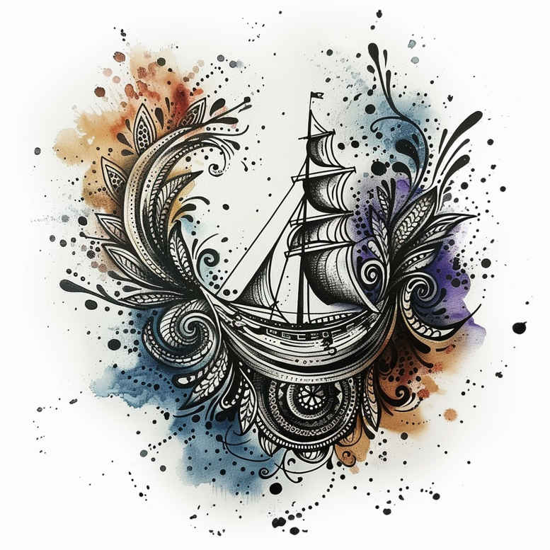 Colorful watercolor ship tattoo design concept: orange sails, blue waves, brown hull, red accents, ink pots and pencils around; AI-generated tattoo project; not a cover-up.