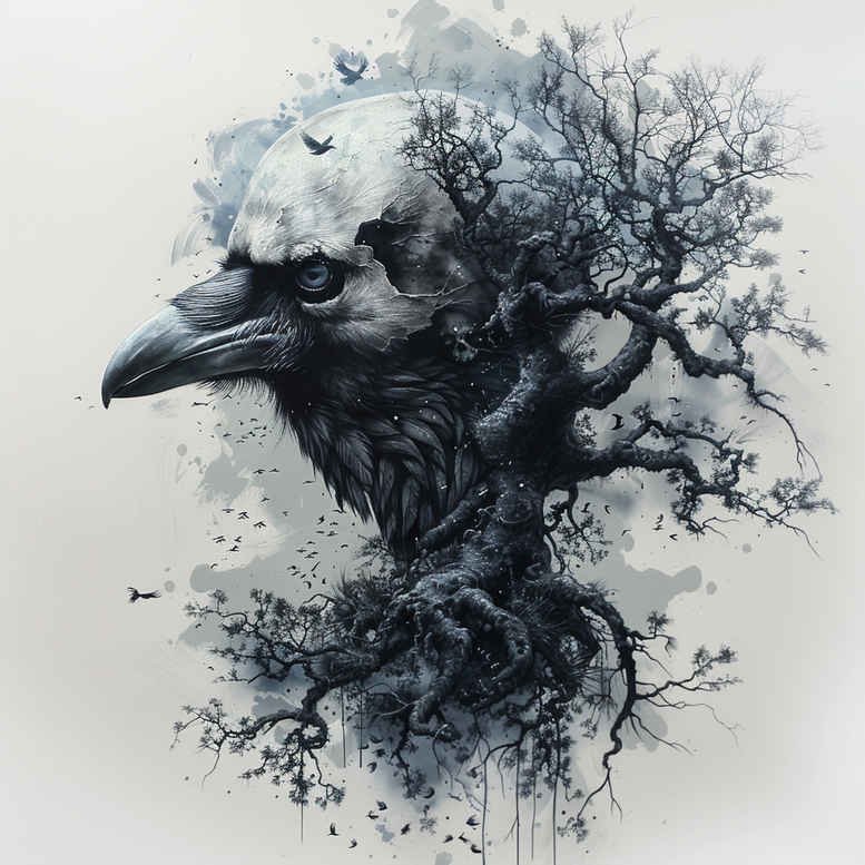 AI-generated tattoo project concept presenting a dark, cohesive silhouette of a crow’s head morphing into a gnarled tree. The composition relies on black and grey shading, with delicate linework defining the crow’s bill and eye, while the branches fracture into intricate, almost tattoo-machine-like patterns. The interplay of negative space and ink splatter creates a dynamic, breathing form that reads as a single design rather than separate elements, ideal for a large shoulder, back, or chest piece. The crow symbolizes transformation and mystery; the tree evokes growth, resilience, and rooted strength; together they offer a meaningful tattoo design for someone seeking a narrative ink. The technique favors fine line detailing, soft grey washes, and contrast-rich blacks to produce depth without over-saturation, ensuring the piece ages gracefully on the skin. This pattern-rich composition can easily scale down for smaller placements while maintaining clarity through crisp outlines and stippling. Given its darkness and dense shading, this concept is particularly well-suited as a cover-up design to conceal prior work while adding a bold, new silhouette. The artwork aligns with contemporary black and grey tattoo aesthetics, yet it nods to illustrative traditions found in Japanese style tattoo and neo-traditional influences through its symbolic motif pairing. In practice, tattoo artists can adapt the branches to wrap around rims, cuffs, or sleeves, while the crow’s contour anchors the piece. This is an AI-generated tattoo project, suitable for a custom tattoo design, and it leverages ink to convey mood, texture, and meaning across body art canvases. For seekers of meaningful tattoos, this design slots into the catalog of fine line tattoo and black and grey genre, and it serves as a robust template for a larger, pattern-rich body suit while maintaining clarity on small scales.