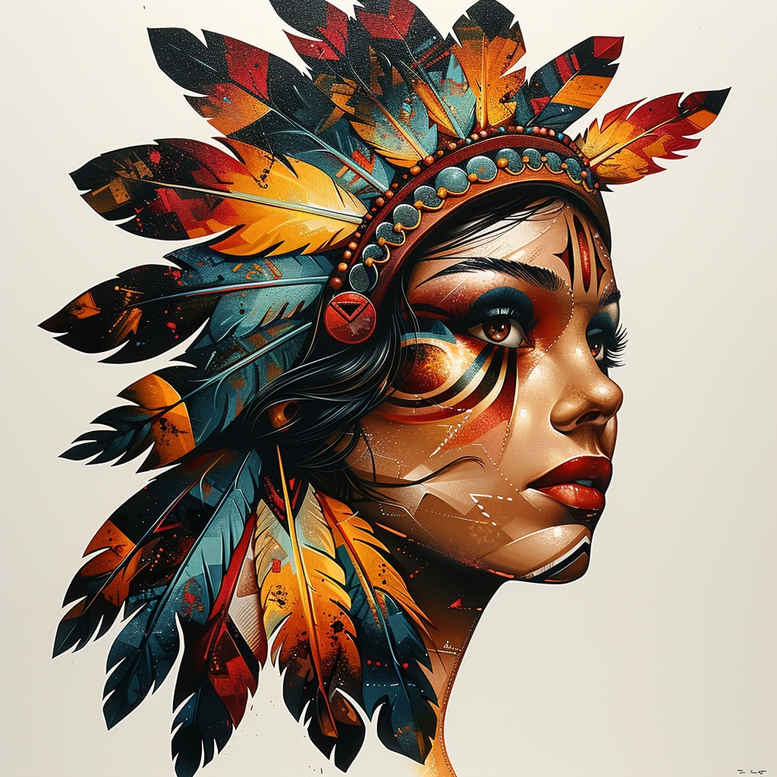 AI-generated tattoo project concept: a vivid portrait in profile of a woman wearing an elaborate feathered headdress. The face is rendered with smooth shading and crisp line work, giving a lifelike presence that contrasts with the dynamic plumage. Feathers explode in a full spectrum of warm oranges and ambers and cool blues and teals, each plume defined by graphic patterns and gradient color transitions that imply light and motion. The headdress forms a bold halo around the head, balancing realism with decorative color blocks that read as contemporary tattoo design. Skin is treated with black and grey gradients to ground the image, while the feathers remain saturated for maximum impact in color ink. The concept bridges tribal and Japanese-inspired motifs with a realistic portrait approach, making it adaptable from small subjects to larger canvases like sleeves or back pieces. Fine line precision marks the feather contours, complemented by painterly shading on the face and neck to achieve a cohesive, high-contrast look. For meaningful tattoos, the motif evokes themes of freedom, identity, and ceremony, with the feather as a focal symbol. This is an AI-generated tattoo project that demonstrates how color realism and graphic tattoo language can coexist, offering a versatile blueprint for custom tattoo design and body art in both color and black and grey workflows. Key visible elements are the face, feather, headdress, ear, and hair, which together form a striking portrait that can be expanded with floral or geometric accents while preserving the strong silhouette and vibrant palette. The design invites experimentation with size, placement, and ink techniques, ensuring it translates well from concept sketch to wearable tattoo; it also suits small tattoos, rose or lotus flower tattoos, and can align with Japanese style tattoo, tribal tattoo aesthetics, and black and grey or full-color workflows.