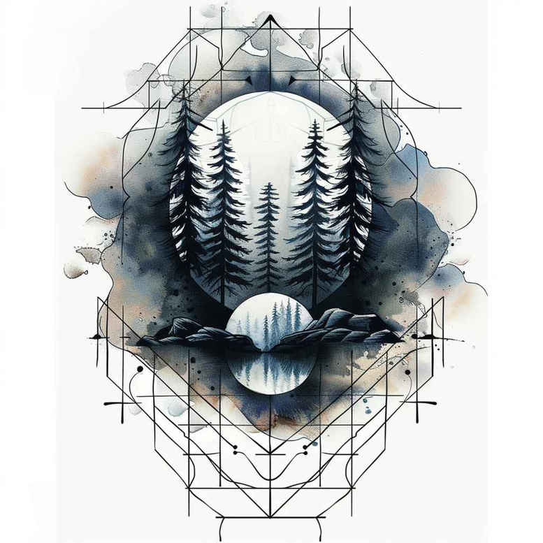 This AI-generated tattoo project explores the intersection of nature and geometry through a quiet monochrome narrative rendered in black and grey. At its heart, a circular frame encloses a forest scene: tall pine trees stand in silhouette, their forms tapered and precise, while a shallow lake breathes beneath, its surface hinting at a mirror like reflection. The watercolor wash surrounding the circle provides a cool blue gray ambiance that offers depth without distracting from the linework. Surrounding the circle, a geometric grid and polygonal facets extend outward, creating a deliberate pattern that contrasts with the organic silhouette of the trees. This combination of clean fine line outlines and soft tonal shading embodies a contemporary tattoo design that remains timeless. The design relies on negative space to keep the composition legible when scaled to smaller sizes, making it suitable for small tattoos or as a larger statement piece. Symbolically, the forest suggests endurance and direction, the lake invites contemplation, and the circle symbolizes wholeness and cycles, while the enclosing grid implies structure and balance. The piece adapts well to black and grey ink, preserving contrast in both refined details and broader strokes. As a demonstration of AI generated art translated into tattoo concepts, it reflects current trends toward meaningful tattoos that fuse minimalism with graphic geometry. It also serves as a versatile template for cover up possibilities if the wearer seeks to replace older work with a more cohesive design. In practice, this concept can be refined into a custom tattoo design with variations in line weight, density, or scale, while keeping the same core motifs: trees, lake, circle frame, and geometric pattern. Keywords to guide editors and readers include tattoo, tattoo design, meaningful tattoos, fine line tattoo, lotus flower tattoo, infinity tattoo, tribal tattoo, rose tattoo design, small tattoos, flower tattoos, custom tattoo design, Japanese style tattoo, black and grey, realistic tattoo, body art, ink.