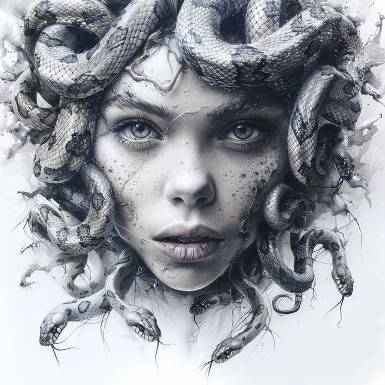 This grayscale Medusa-inspired portrait merges a woman’s features with a crown of coiled serpents, creating a bold tattoo design that sits at the intersection of myth and modern body art. Rendered in black and grey with careful shading and subtle gradient transitions, the piece captures lifelike skin texture and the sinuous motion of the snakes as they frame the gaze and wrap around the head. Conceived as an AI-generated tattoo project, the concept translates cleanly into ink-ready form, offering a dramatic cover-up option for clients seeking to obscure prior marks while maintaining a striking focal point. The serpents introduce pattern-like rhythm across the composition, enabling sizing from small tattoos to large back- or sleeve-length pieces, and allowing customization of line weight to suit fine line tattoo aesthetics or more robust realism. Symbolically, Medusa evokes transformation, protection, and awakening, lending depth to a design that remains visually arresting in grayscale. The palette emphasizes contrast and mood, with bold shadows and soft highlights, making it compatible with Japanese style shading influences or Western realism approaches. This concept offers meaningful tattoos potential by aligning myth with personal narrative, and it serves as a versatile template for custom tattoo design that can be adapted to placement, scale, or color if desired. In short, it delivers a compelling story, a timeless black and grey rendering, and a practical pathway for cover-up applications, inviting further refinement to reflect individual meaning, ink technique preferences, and skin type.