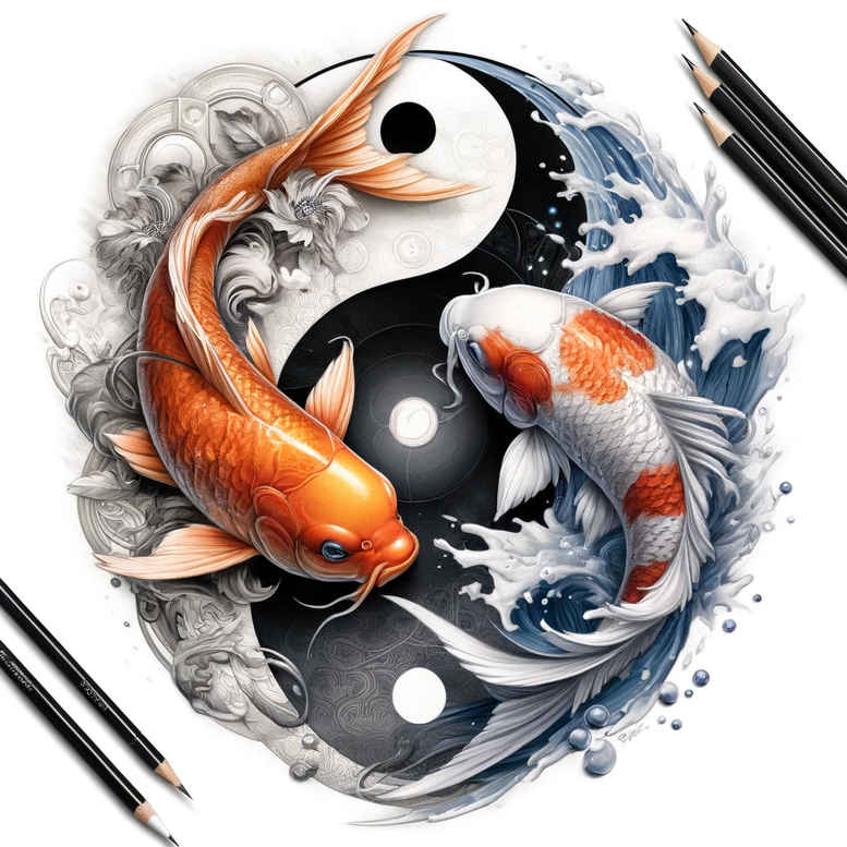 This vibrant tattoo design pairs a pair of koi fish with a central yin-yang and flowing waves, rendered in bold color and precise linework suitable for a cover-up. The orange and white koi contrast with the inky black and white yin-yang and blue-toned water, achieving a balanced composition that reads clearly from a distance and reveals subtle shading up close. The piece borrows strongly from Japanese style tattoo influences, with clean outlines, smooth gradients, and bold color blocking, using negative space and highlights to create depth on skin. Symbolically, koi signify perseverance and transformation, while the yin-yang embodies balance and duality, and the waves convey motion, life’s currents, and resilience; together they form a meaningful tattoo narrative perfect for meaningful tattoos. The design scales well for placements on the arm, shoulder, back, or chest, and can be adapted to color versions or monochrome black and grey depending on client preference. As an AI-generated tattoo project, it demonstrates how algorithmic concepts translate into ink-ready drafts and how cultural motifs can be translated into contemporary body art. For cover-up considerations, the composition’s bold shapes and color blocks enable effective concealment of older tattoos with minimal linework disruption, while offering a fresh, high-contrast look. The motifs of koi, yin-yang, and waves offer a timeless story of strength, balance, renewal, and adaptability, aligning with trends in meaningful tattoos and Japanese imagery. In terms of technique, expect crisp linework, vibrant shading, and smooth gradient blends to achieve depth on skin; this design also accommodates fine line tattoo approaches or larger, more saturated tattoos depending on placement. Overall, this is a versatile, custom tattoo design that blends classic symbolism with modern aesthetics, suitable for small tattoos or expansive body art projects and ideal for collectors seeking a striking, symbolic piece.